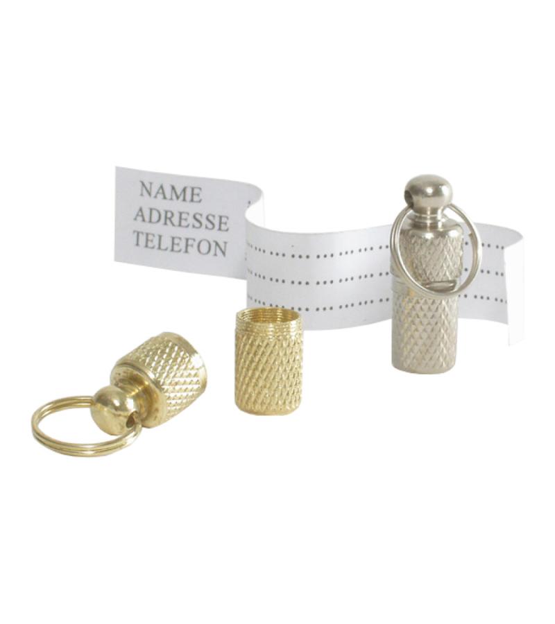 Een zilver of goudkleurige adreskoker voor uw hond met daarin een papiertje. Hierop kunt u de naam van uw hond, uw adres en telefoonnummer noteren, zodat bij vermissing uw huisdier weer snel terecht is.