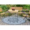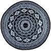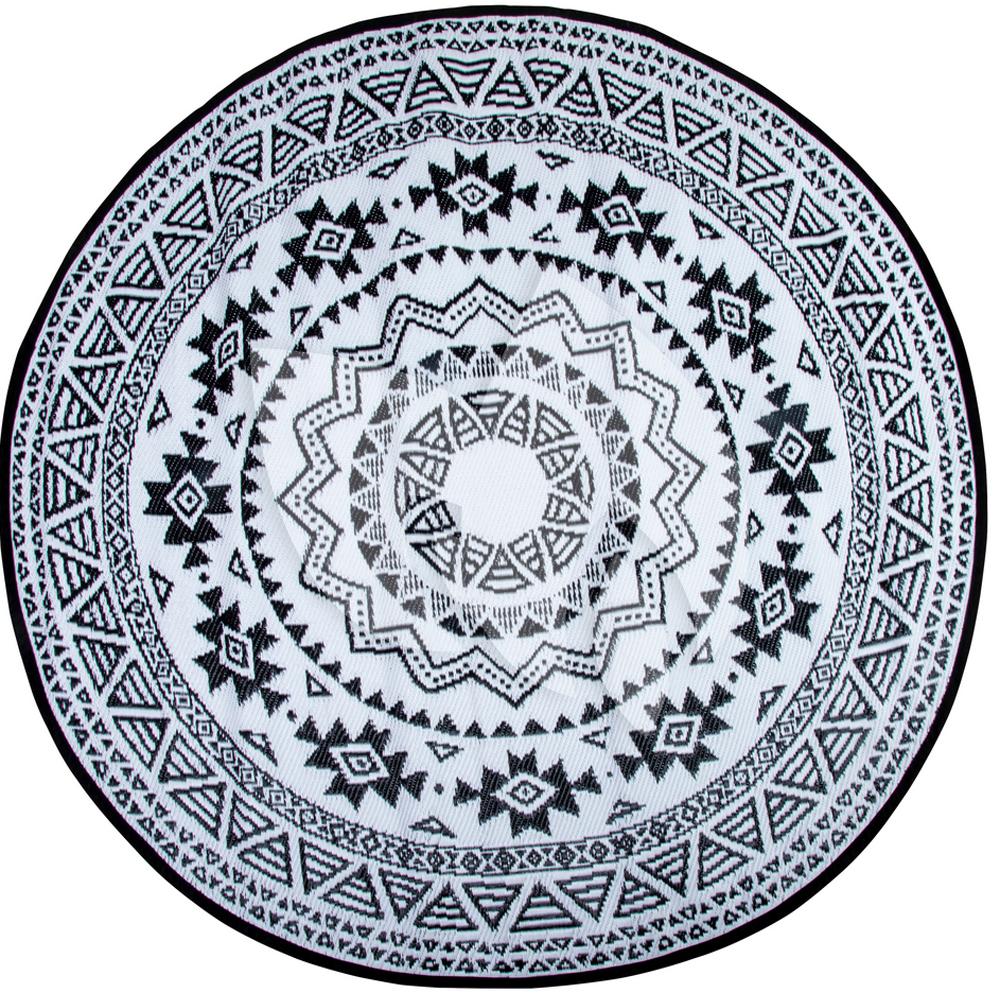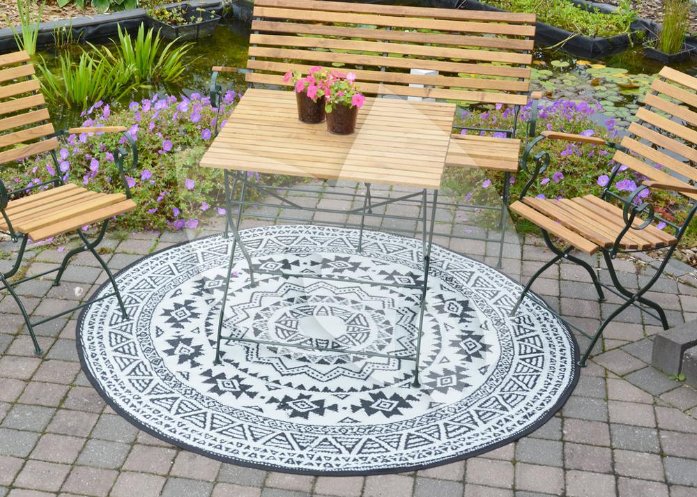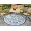 Rond is het nieuwe recht! Waar men voornamelijk geneigd is lijnrechte vormen in de inrichting terug te laten komen, maakt rond nu zijn opmars! Zo ook dit ronde tuintapijt met Azteken print. Het vloerkleed heeft een diameter van 180cm. Dit leuke kleed is uiteraard onder uw tuinset te plaatsen, maar denkt u ook eens aan een gedeelte van uw loungeset; het tuintapijt kan ervoor zorgen dat dat bijzettafeltje met uw favoriete planten nog meer in het oog springt!