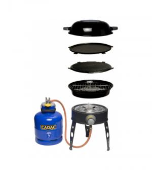 Zeer compacte en lichtgewicht gasbarbecue van het merk CADAC. De Safari Chef is voorzien van wel vijf verschillende kookoppervlakken: bbq rooster, pandrager, wok/deksel en een omkeerbare bak- en grilplaat. De CADAC Safari Chef kan worden aangesloten aan het Power pak van CADAC, of een reguliere gasfles (let op: levering exclusief gasdrukregelaar en gasfles).