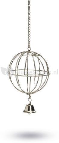 Een chroom metalen voederbal met deur en bel. U opent het deurtje, vult de chroom metalen bal met hooi, hangt hem in de kooi en uw konijn of andere knager heeft lekker wat te knabbelen. Inclusief bel.