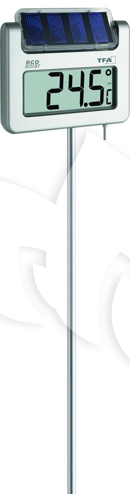 Deze thermometer is voorzien van een zonnepaneel, deze voorziet de thermometer van verlichting. De meegeleverde oplaadbare batterij wordt opgeladen door zonne-energie. Een milieuvriendelijke thermometer dus. De thermometer is voorzien van een ruim display om de buitentemperatuur af te meten. De thermometer is in te stellen op 3 standen; de huidige temperatuur, de temperatuur afwisselend met huidige tijd of een afwisseling van temperatuur, huidige tijd en de min/max temperatuur. Deze thermometer steekt u op iedere gewenste plek in de tuin.