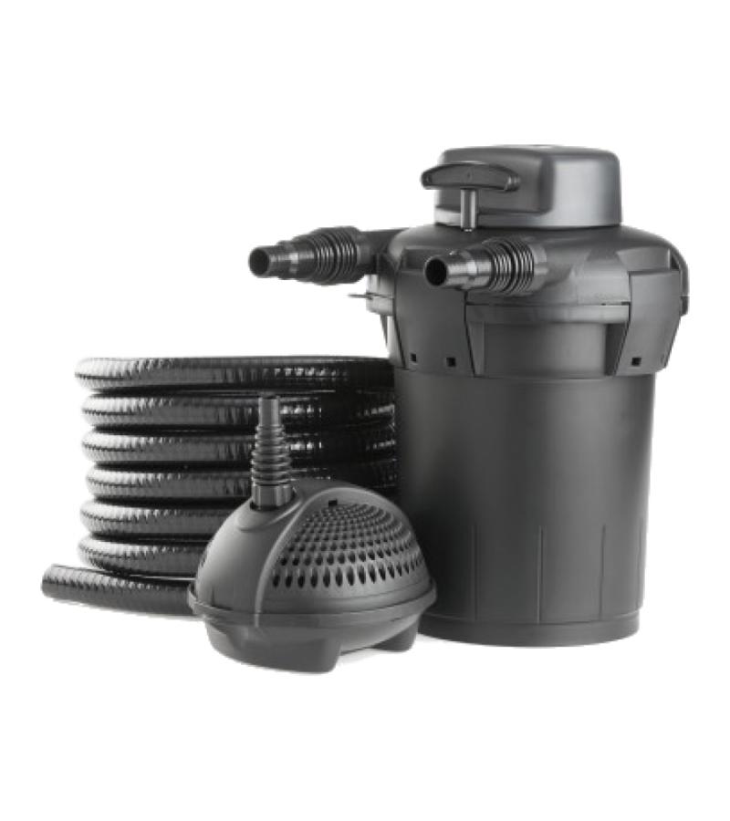 Drukfilter set 5000 bestaat uit een drukfilter PondoPress met geïntegreerd UVC en de daarop afgestemde filter- en beeklooppomp Pondomax Eco.