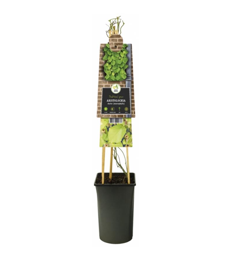 Duitse pijp kenmerkt zich met een groot heldergroen hartvormig blad. Het grote blad kan een doorsnede bereiken van wel 25cm. In een razendsnel tempo kan Duitse pijp dan een groen bladerdek geven. Deze sterke klimmer bloeit in juni en juli met bruingele bloemen die, in verhouding tot het blad, vrij klein zijn. Deze klimplant slingert zich een weg omhoog en kan dan een hoogte van 8m bereiken. Omdat u Duitse pijp op ieder gewenst moment kunt snoeien is de plant zeer geschikt voor bijvoorbeeld een pergola.