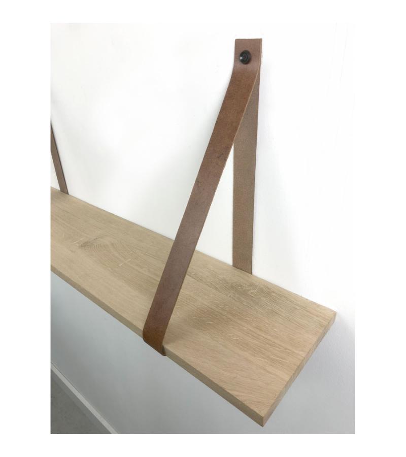 Eiken 18mm wandplank recht 110 x 30 cm inclusief leren riemen cognac