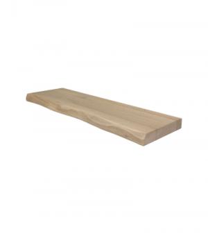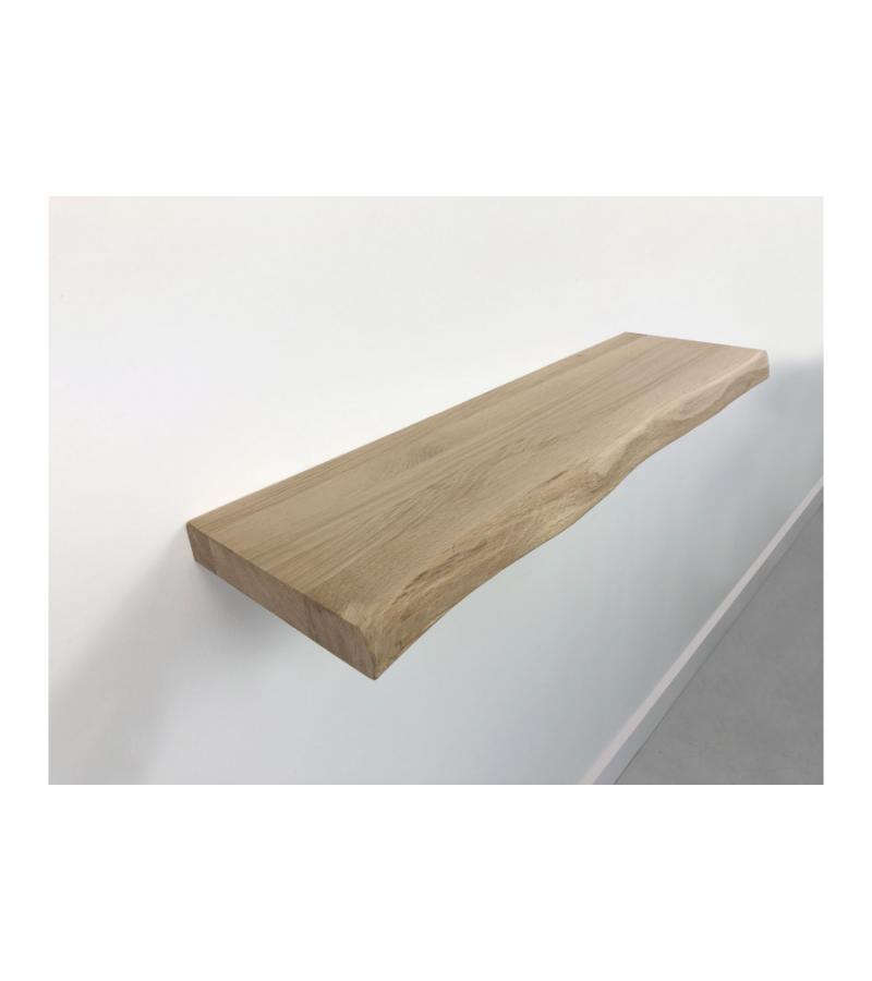 Zwevende wandplank van eikenhout met zichtbare golvende boomstam vorm aan het vooraanzicht.