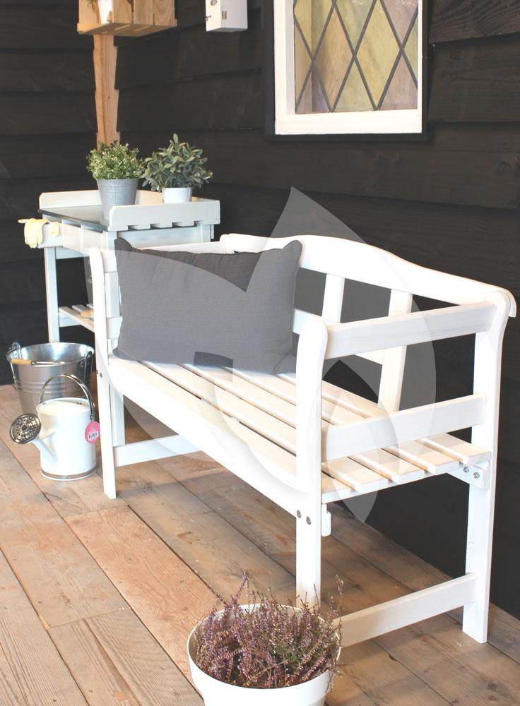 Deze tuinbank is voor iedere tuin of balkon een aanwinst. De bank is gemaakt van Noord Europees vurenhout. De bank heeft een mooi opvallend uiterlijk, mede door zijn moderne witte kleur. De rugleuning en de armleuningen zijn al voorgemonteerd dus u heeft het bankje eenvoudig in elkaar gezet. Het bankje is naast om op te zitten ook leuk als decoratie om planten of dergelijke op te zetten.