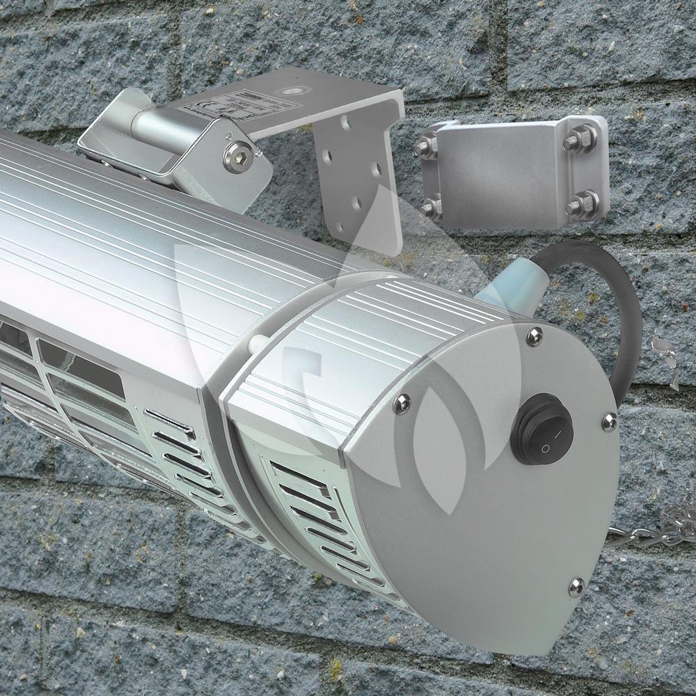 De terrasverwarmer voorziet u van warmte via infraroodstraling. Infrarood warmt niet de lucht op in de omgeving, maar juist de personen die binnen het bereik van de heater zitten. De speciale golden tube lamp van de terrasverwarmer heeft een levensverwachting van maar liefst 8000 branduren waarbij hij zeer effectief werkt. De extra reflector in de terrasverwarmer zorgt voor een betere warmte weerkaatsing waardoor er nauwelijks warmte verwaait. De terrasverwarmer is 100º draaibaar waardoor u hem in de hoek kunt hangen en de warmte gericht kunt afstemmen. Met een vermogen van 2500 Watt kan de terrasverwarmer een oppervlakte van maximaal 25m² opwarmen. De terrasverwarmer kan het hele jaar door buiten blijven hangen en is volledig stof- en spuitwaterdicht.