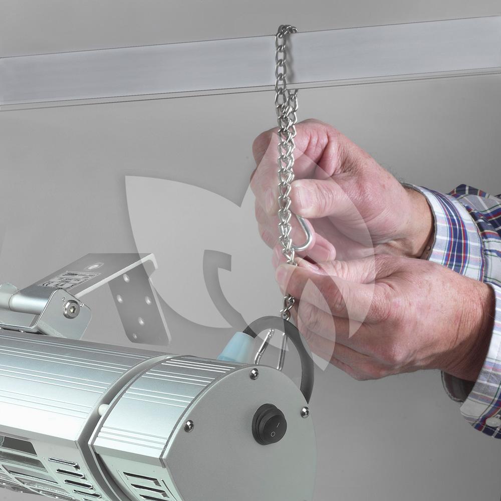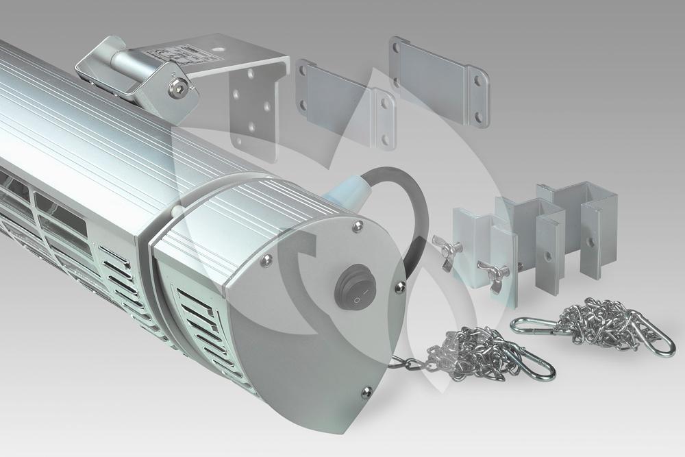 De terrasverwarmer heeft verschillende bevestigingsmogelijkheden. U kunt de Golden 2500 Ultra RCD terrasverwarmer aan de muur bevestigen, ophangen aan een frame of parasol of ophangen aan het plafond. Ten slotte kunt u de terrasverwarmer op een standaard plaatsen. Door de dubbele isolatie in de heater wordt de bovenzijde niet extreem heet waardoor het veilig is om de heater aan de spaken van een parasol op te hangen. De terrasverwarmer wordt geleverd inclusief 2 muursteunen, drie verschillende maten beugels, set kettingen met 2x2 karabijn-haken, afstandsbediening en bevestigingsmateriaal.
