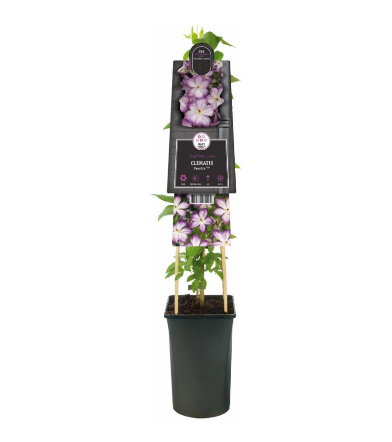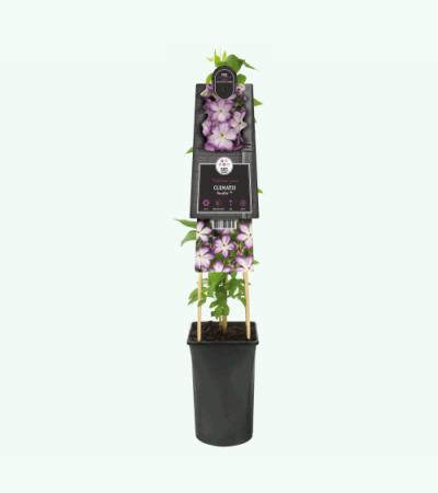 De Clematis Pernille is een prachtige klimplant voor in de tuin die in volle bloei staat in de zomermaanden. De plant is voorzien van prachtige wit met paars gekleurde bloemen die erg sfeervol zijn. De plant klimt het liefst op tegen een muur waar de meeste zonnestralen komen op een dag.