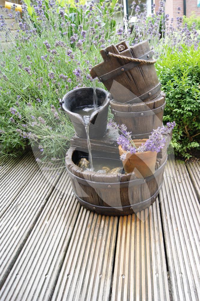 Het waterornament Halifax is een prachtig rustiek en decoratief waterornament voor in uw tuin of op uw terras! Het waterornament bestaat geheel uit vaten en emmers die in elkaar overlopen. Het water loopt zacht stromend vanaf de bovenste emmer langs de andere en komt zo uiteindelijk in het grote vat onderaan terecht. De pomp zorgt ervoor dat het water blijft rond gepompt en dat er een zacht stromend effect ontstaat. De Halifax is een prachtig kunstwerk om naar te kijken en het zacht kabbelende water geeft een ontspannen effect!