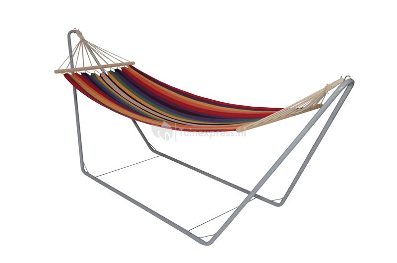 Gebruik deze zeer kleurrijke hangmat met metalen frame om lekker weg te dromen in uw tuin. Het metalen frame is uit elkaar te nemen, zodat deze bij het opbergen weinig ruimte in beslag neemt. De hangmat kan een gewicht dragen tot 150 kilogram.