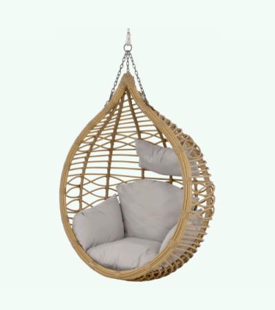 Een ophangpunt is niet nodig, de hangstoel komt in combinatie met een standaard waar u de hangstoel in hangt. Middels de kettingen kunt u de hangstoel op de juiste hoogte instellen. Het gepoedercoat frame kan tevens buiten staan. Dat geldt tevens voor de hangstoel dat bestaat uit een aluminium frame afgewerkt met het weerbestendige én onderhoudsvriendelijke wicker. De neutrale beige kleur van stoel en kussens maakt dat de stoel overal bij past.
