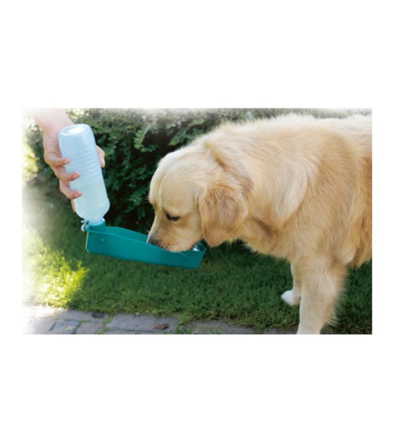 Met deze draagbare drinkfles heeft u een flesje en bakje in één. Altijd voorzien van schoon drinkwater voor uw hond voor bijvoorbeld op de camping, tijdens het wandelen of in de auto.