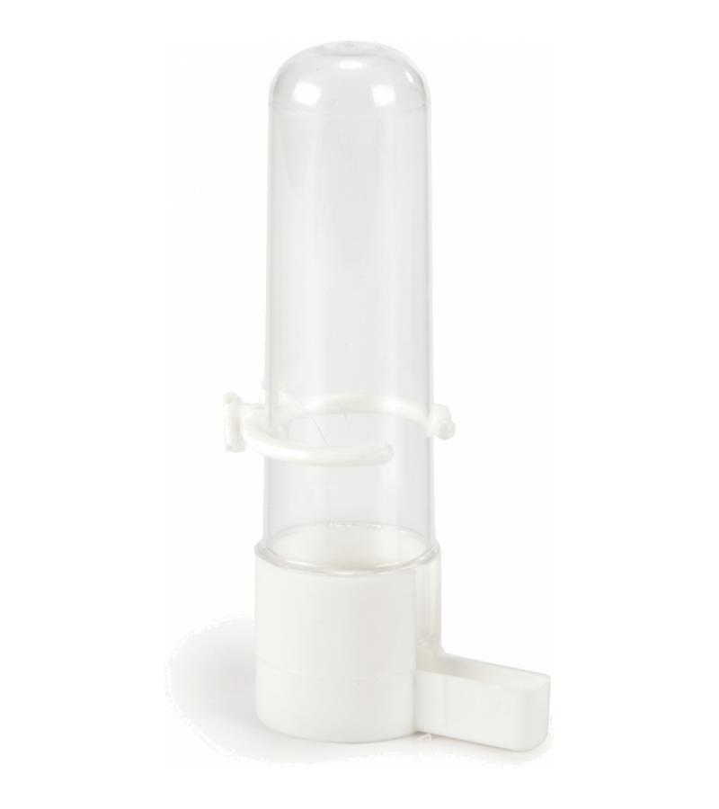 Een plastic drink en voederfontein groot, staafmodel, voor diverse vogelkooien. Kleur: wit, transparant.