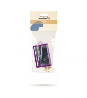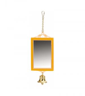 Een plastic parkieten spiegel, vierkant, voor in de vogelkooi. Inclusief bel en ophangketting.