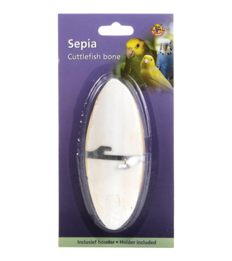 Sepia bestaat uit harde kalk aan de buitenzijde en de binnenzijde is wat zachter en bestaat uit zouten. Het is een 100 procent natuurproduct. Sepia is een bron van mineralen die uw vogel ten goede komen. Voorzien van een handige ophangclip aan de achterzijde.
