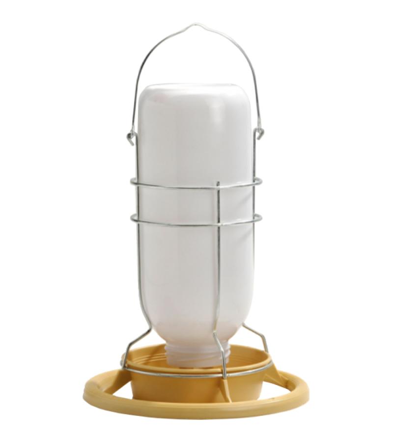 Een pothouder met plastic pot voor voer of water. Eenvoudig te vullen. De fles kunt u ophangen of gewoon neerzetten. Voor bijvoorbeeld in volieres.