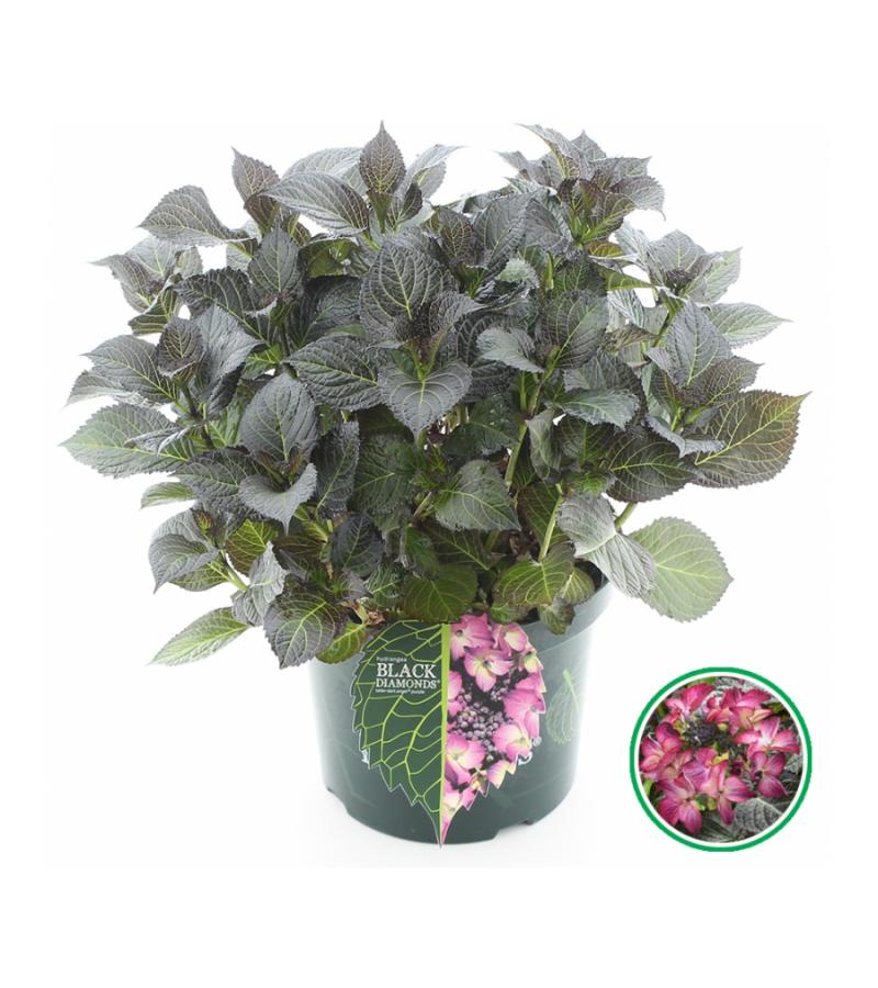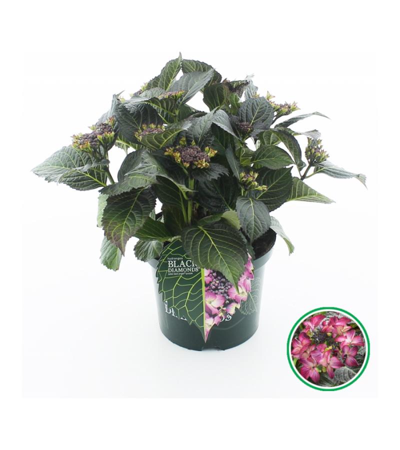Deze paarse randbloeier heeft opvallende, grote schermen bloemen tijdens de bloeiperiode. De heldere kleuren van de bloemen springen nog meer in het oog door het donkere blad van de hortensia. Het blad is zeer donkergroen van kleur, bijna zwart en is gesierd met felgroene nerven. Het is dan ook niet moeilijk te bedenken waar deze serie zijn naam ‘Black Diamond’ aan te danken heeft. Vindt u een ‘gewone’ boerenhortensia wat te gewoontjes? Laat u positief verrassen door dit exemplaar en u bent verkocht!
