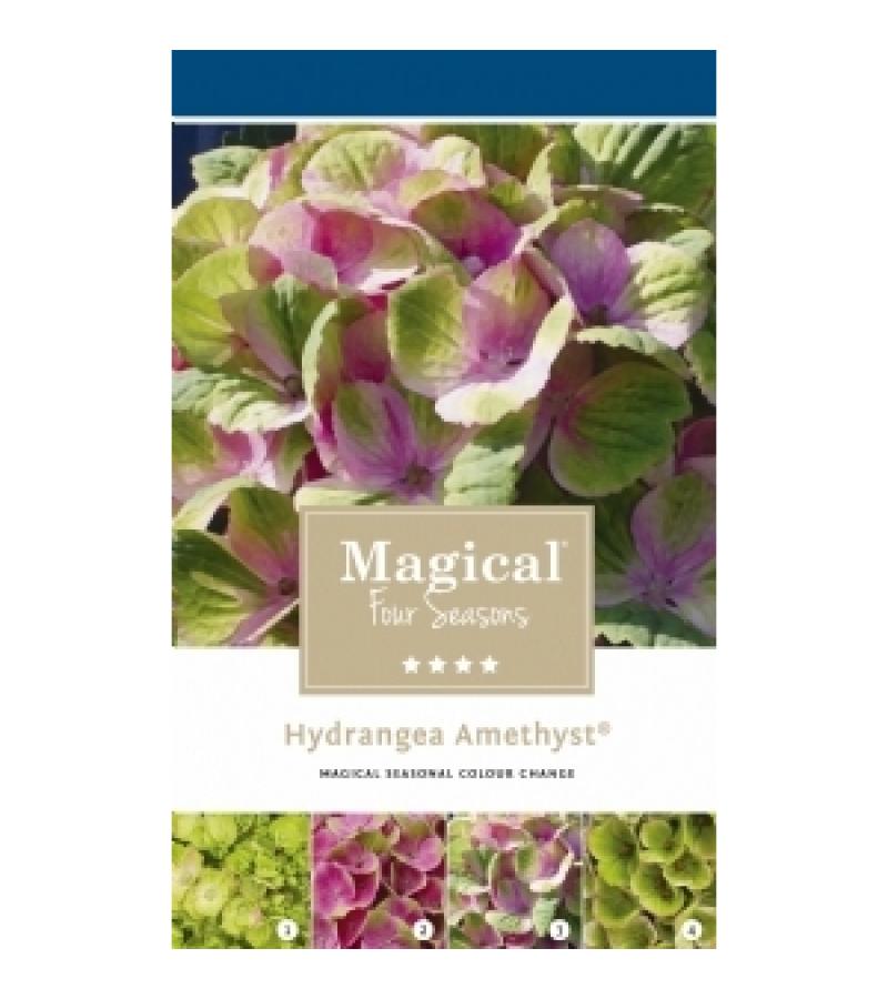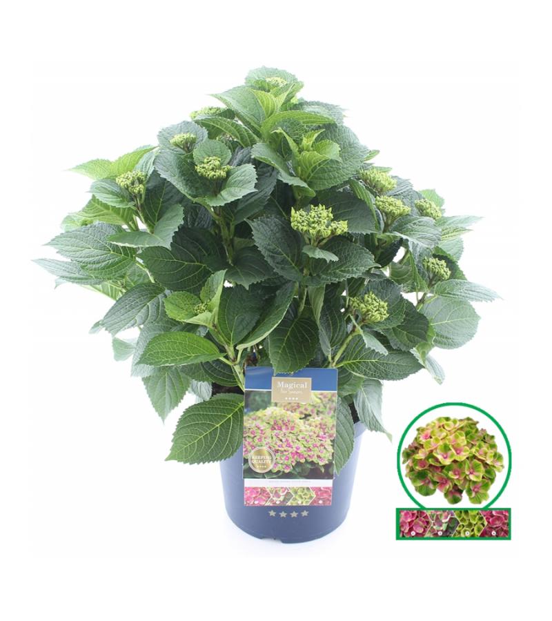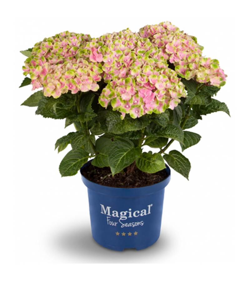 Zeker 6 maanden plezier heeft u van deze Magical 4 Seasons hortensia. Het is een stevige hortensia die zijn bloembollen trots draagt, maar waar deze hortensia echt punten mee scoort is zijn kleurverandering tijdens de bloeiperiode. De hortensia verandert van roze/groen naar lichtroze om vervolgens te eindigen met een diepgroene bloembol. Deze kleurschakering maakt dat de hortensia een absolute topper onder de hortensia’s is. Wie wil er nu niet 6 maanden getuige zijn van deze magische veranderingen?