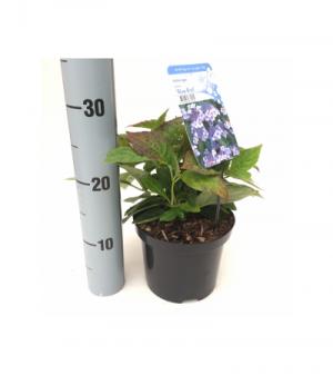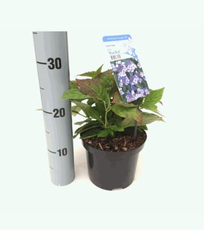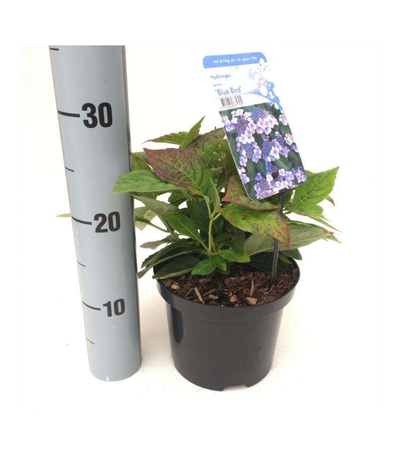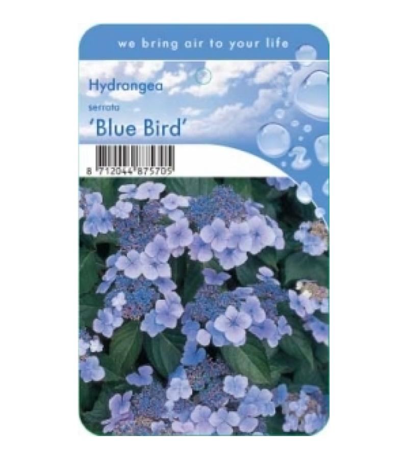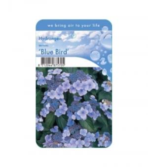 Japanse berghortensia “Blue Bird” is een zeer verfijnde hortensia. De hortensia bloeit met bloemschermen in blauw of roze tinten. De Blue Bird is een echte schermhortensia, de bloemschermen bestaan uit vele kleine bloemetjes omringt door enkele grote randbloemen. De randbloemen zijn in het begin van de bloeiperiode meestal wit, daarna nemen ze net als de bloemetjes in de kern een roze of blauwe kleur aan, afhankelijk van de grond waar de hortensia op staat. Het blad heeft extra sierwaarde door rode bladnerven en randen, het groene blad zal richting de herfst een meer rode kleur krijgen.