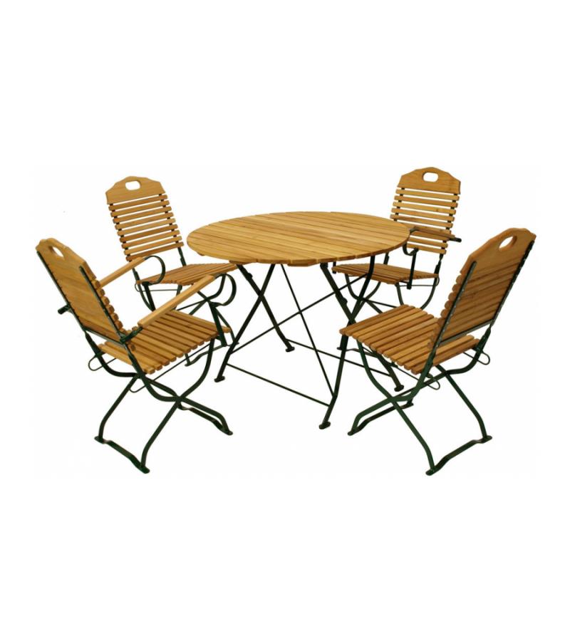 De Bistroset 5-delig inklapbaar met 2 leuningen ⌀ 100 cm - groen frame is een elegante tuinset gemaakt van Robinia hout, een zeer duurzame Europese houtsoort. Het is slijtvast en gedijt goed bij wisselende luchtvochtigheid. De tuinset bestaat uit een ronde tafel en 4 stoelen waarvan twee met armleuning. De zitting van de stoelen is iets afgerond voor extra zitcomfort. De gehele bistroset is inklapbaar en daardoor gemakkelijk op te bergen.