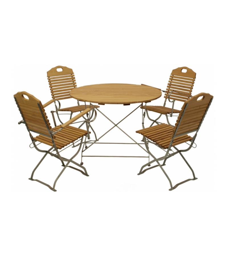 De Bistroset 5-delig inklapbaar met 2 leuningen ⌀ 100 cm - grijs frame is een elegante tuinset gemaakt van Robinia hout, een zeer duurzame Europese houtsoort. Het is slijtvast en gedijt goed bij wisselende luchtvochtigheid. De tuinset bestaat uit een ronde tafel en 4 stoelen waarvan twee met armleuning. De zitting van de stoelen is iets afgerond voor extra zitcomfort. De gehele bistroset is inklapbaar en daardoor gemakkelijk op te bergen.