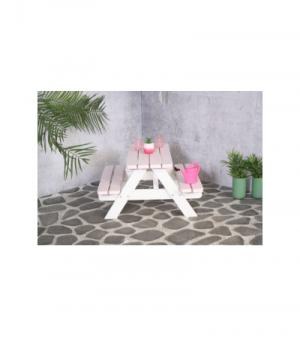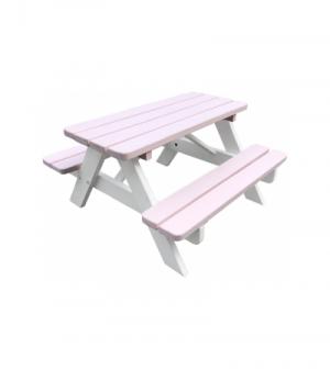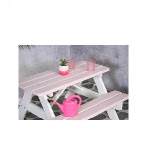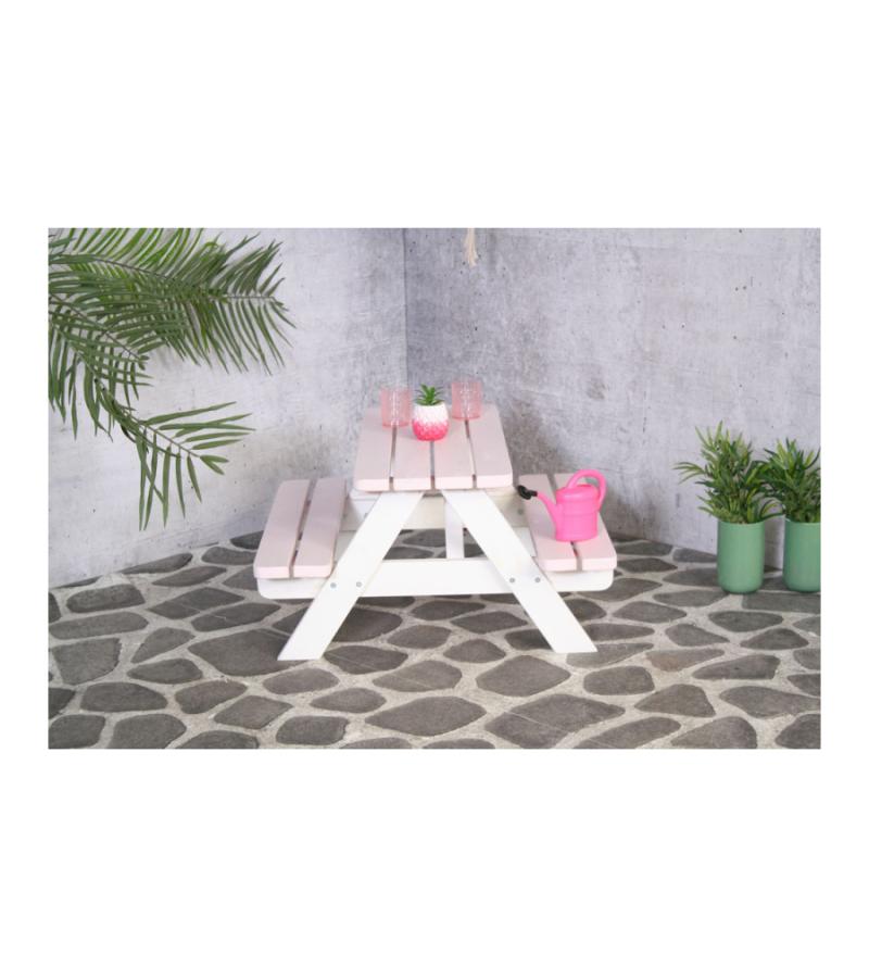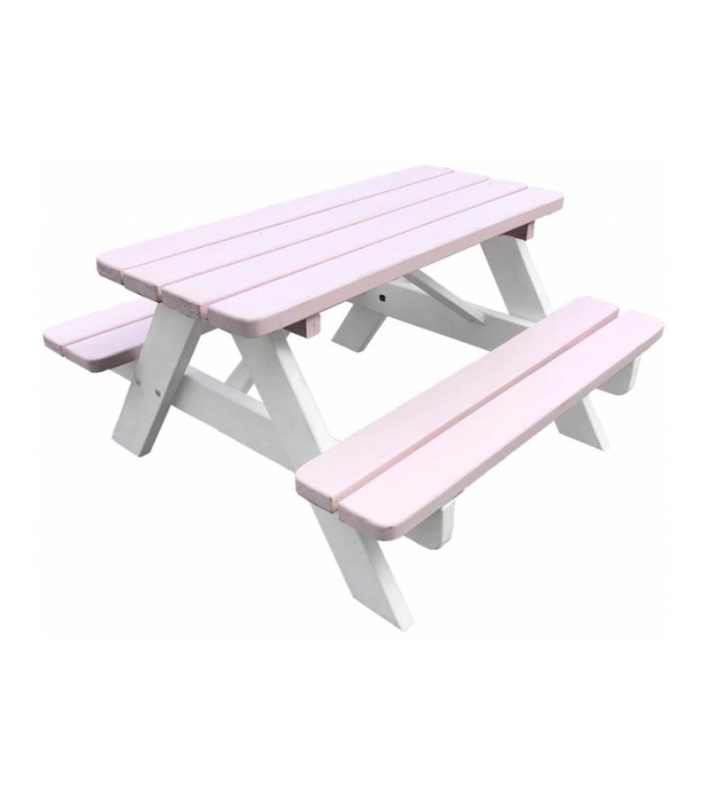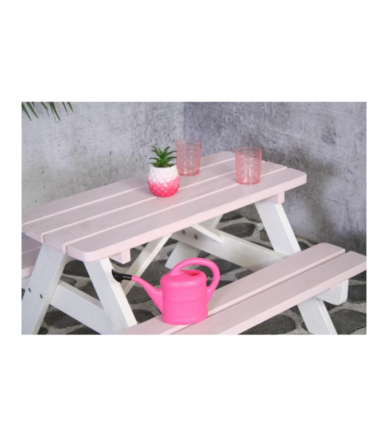 De picknicktafel is gemaakt van geïmpregneerd vurenhout en daarna in wit geverfd met een vrolijk roze tafelblad en bankjes.