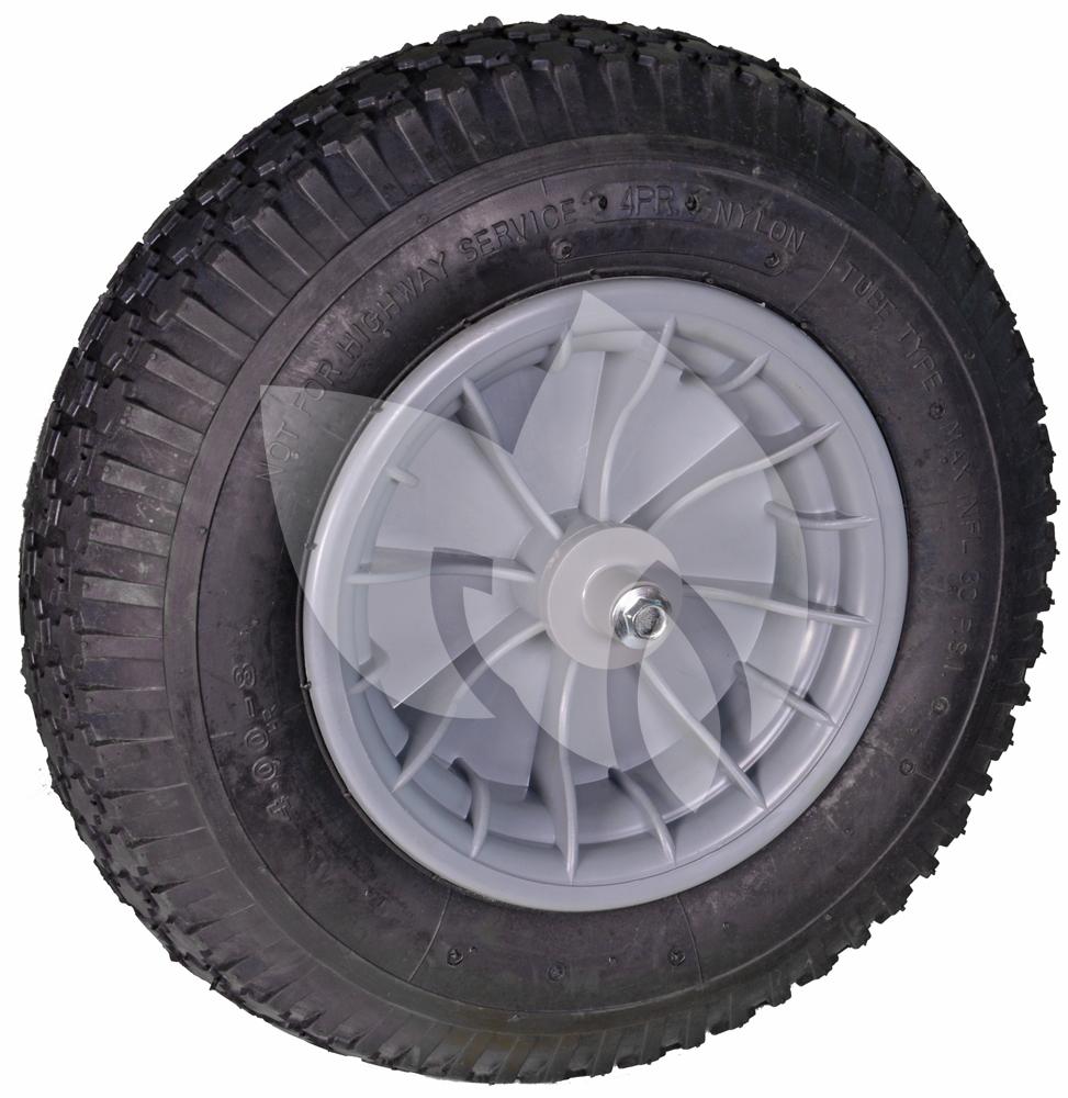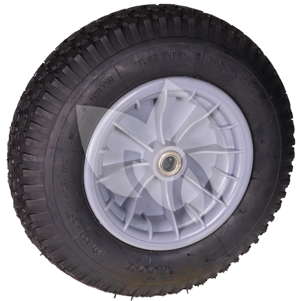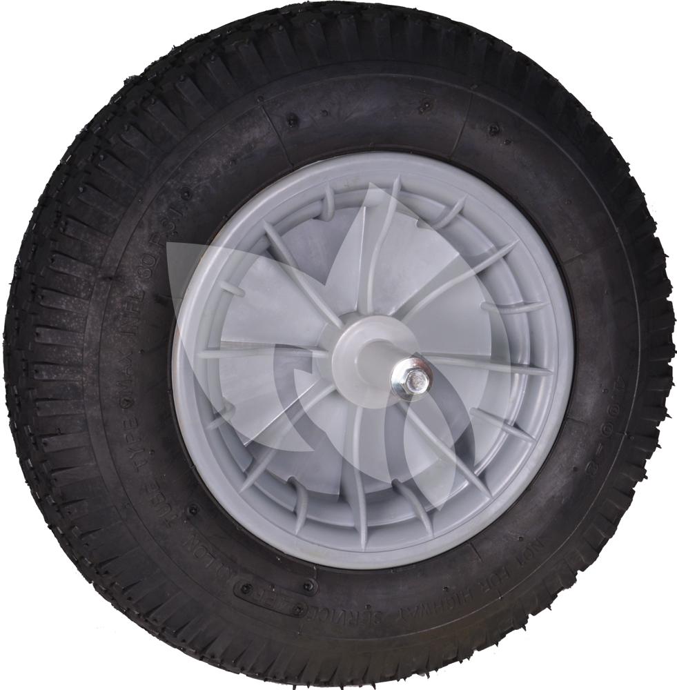 Dit wiel bestaat uit een binnen- en buitenband (luchtband). De velg bestaat uit grijs pvc en het type band is 400x8.