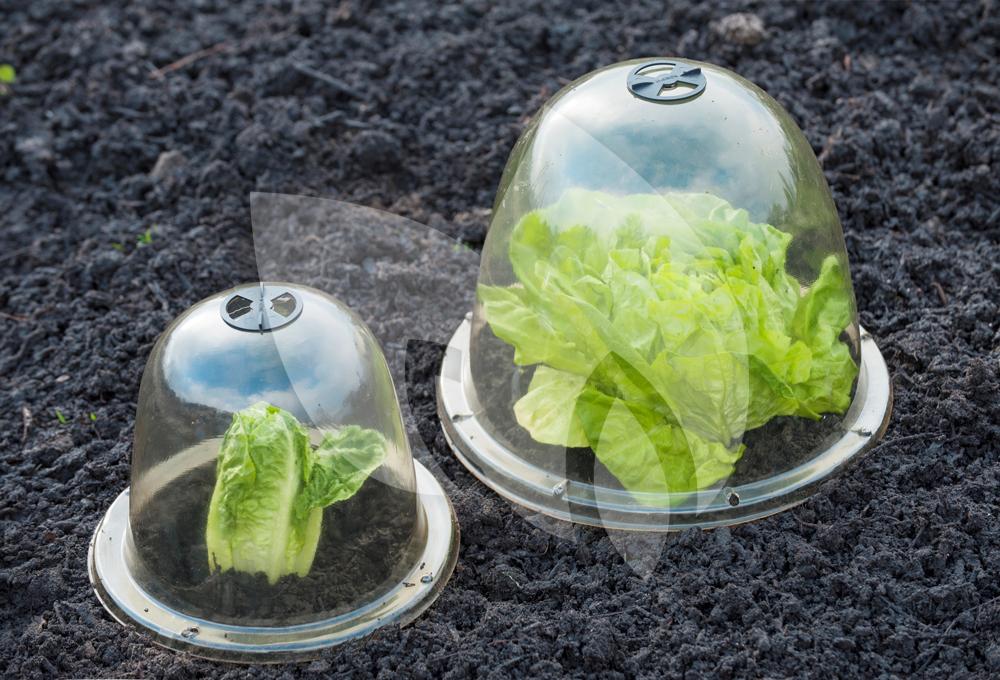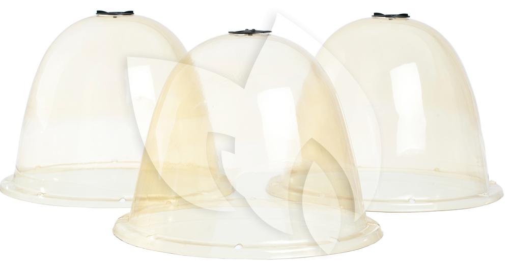 De kweekkappen zijn gemaakt van hard kunststof en transparant van kleur. Om oververhitting te voorkomen zijn de kappen voorzien van een ventilatieopening zodat u ervoor kunt zorgen dat het niet te warm wordt onder de kap. De kappen beschikken over drie verankeringspunten en zijn eenvoudig met de bijgeleverde grondpennen vast te zetten in de grond. De kweekkappen vormen een set van drie stuks en zijn verkrijgbaar in twee verschillende doorsneden.