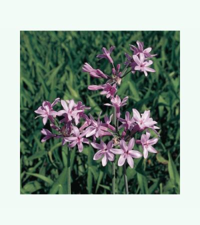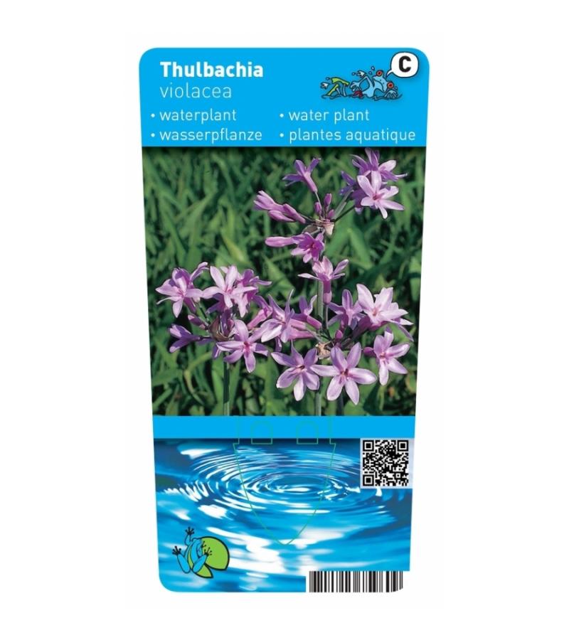 Tulbaghia is voor oorsprong een moerasplant uit Afrika en is ook wel bekend als 'wilde knoflook'. Dit is niet enkel door de geur dat het blad afgeeft bij aanraking, maar ook omdat de plant eetbaar is en daarbij een pittige smaak heeft die aan knoflook doet denken. Net als bijvoorbeeld bieslook is de plant in vele gerechten te gebruiken en wordt dan ook tevens aangeboden als moestuinplant. Hiernaast is tulbaghia tevens een prachtige sierplant die zowel als bodembedekker geplaatst kan worden of solitair de aandacht krijgt. De grasachtige pol met grijsgroen blad wordt in de zomermaanden gesierd door rijkelijk bloeiende stelen. De lila bloemetjes torenen trots boven het blad uit. Hoewel tulbaghia van vochtige grond houdt rondom de vijver, kan hij ook prima in een border geplaatst worden, de bloei kan hierdoor wel iets minder uitbundig worden. Tulbaghia is redelijk winterhard, wat extra bescherming voor deze plant kan geen kwaad! Als een van de mooiste waterplanten is tulbaghia een prachtige aanvulling op uw vijverbeplanting.