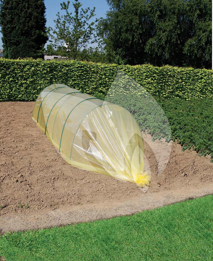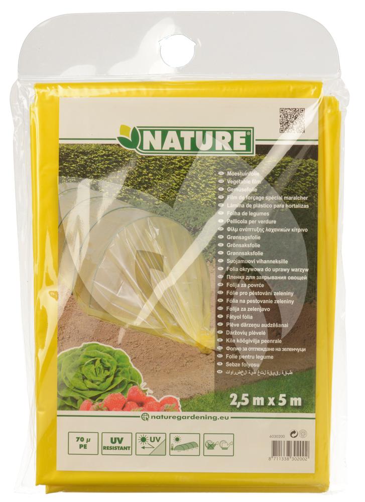 De uv-bestendige moestuinfolie is geschikt voor groenteteelt en gemaakt van polyethyleen (LDPE). De folie heeft een gele kleur en een dikte van 70 µ. De groenteteeltfolie laat 85 tot 88% van de zonne-energie door. Hierdoor worden hevige temperatuursverschillen voorkomen en zorgt het gevormde microklimaat voor een vroege oogst.