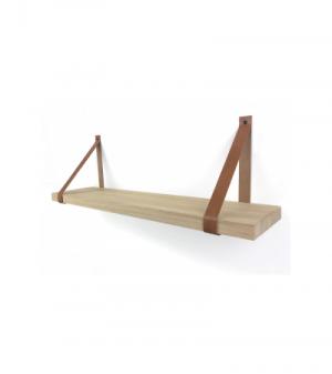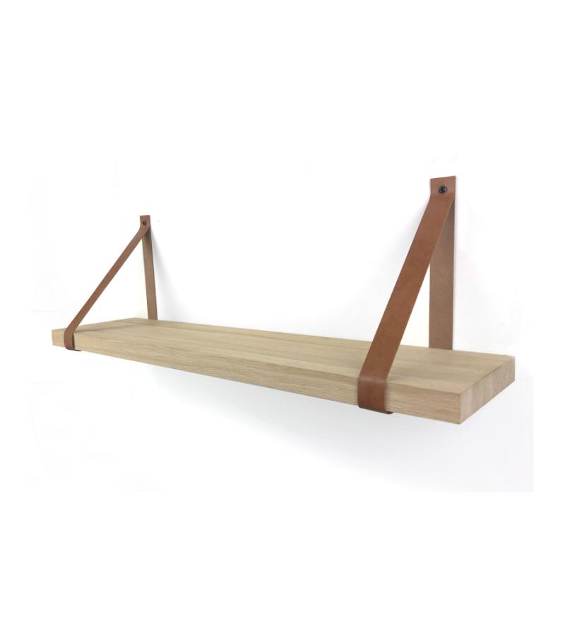 Eiken wandplank massief recht 80 x 30 cm inclusief leren riemen bruin