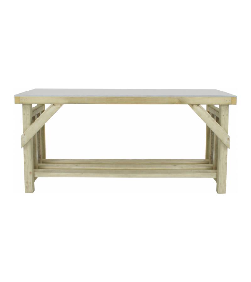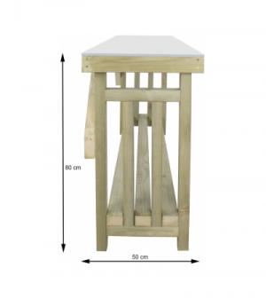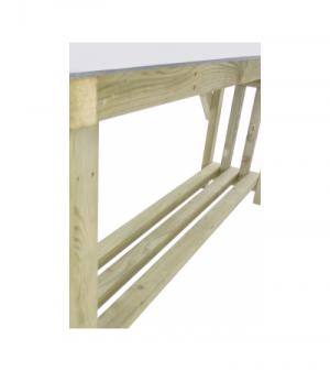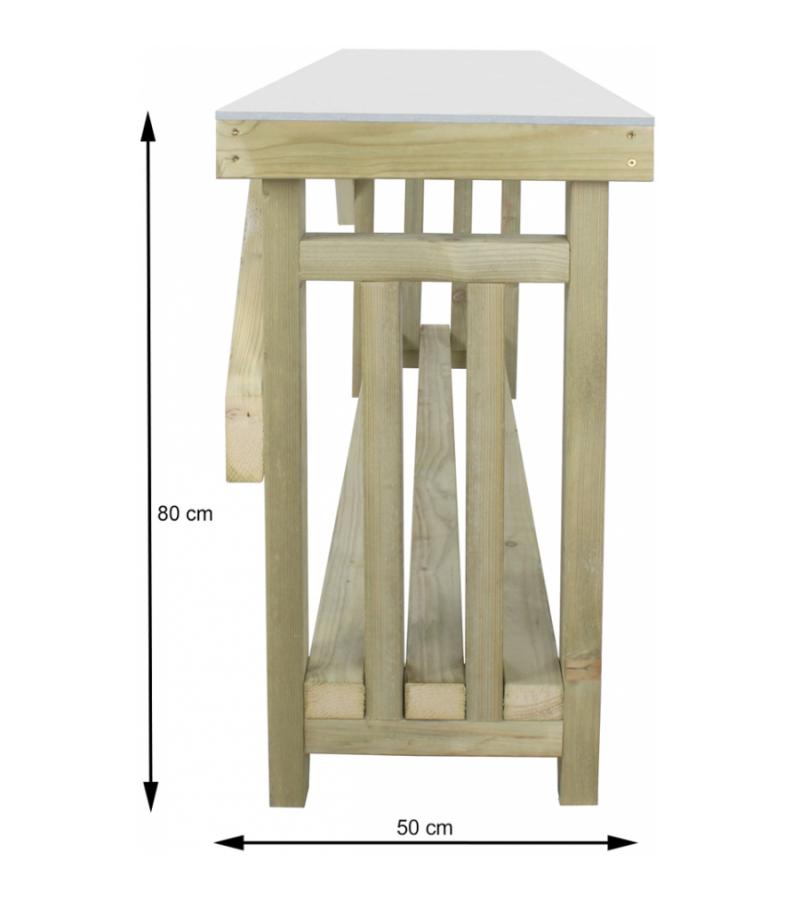 Het robuuste frame van deze grote oppottafel is gemaakt van geïmpregneerd vurenhout en is voorzien van een mooi zinken werkblad. De tafel is gedeeltelijk voor gemonteerd, uiteraard wordt de oppottafel geleverd inclusief montagemateriaal. Het tweede plateau kunt u gebruiken voor de opslag van haardhout of andere tuinbenodigdheden zoals gieters en ongebruikte bloempotten.