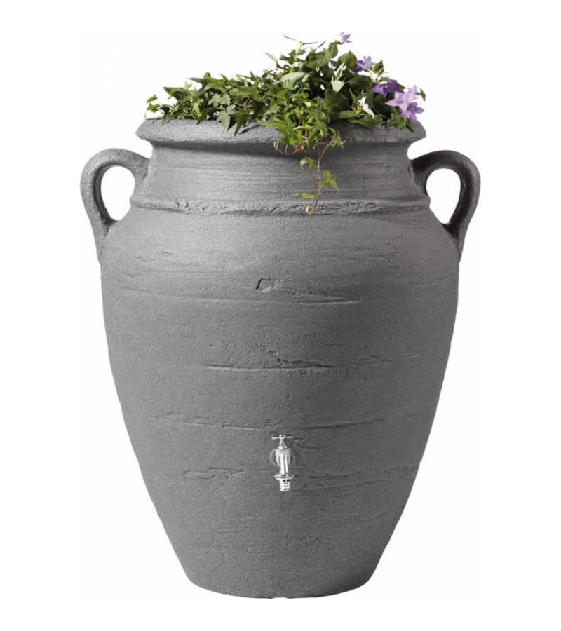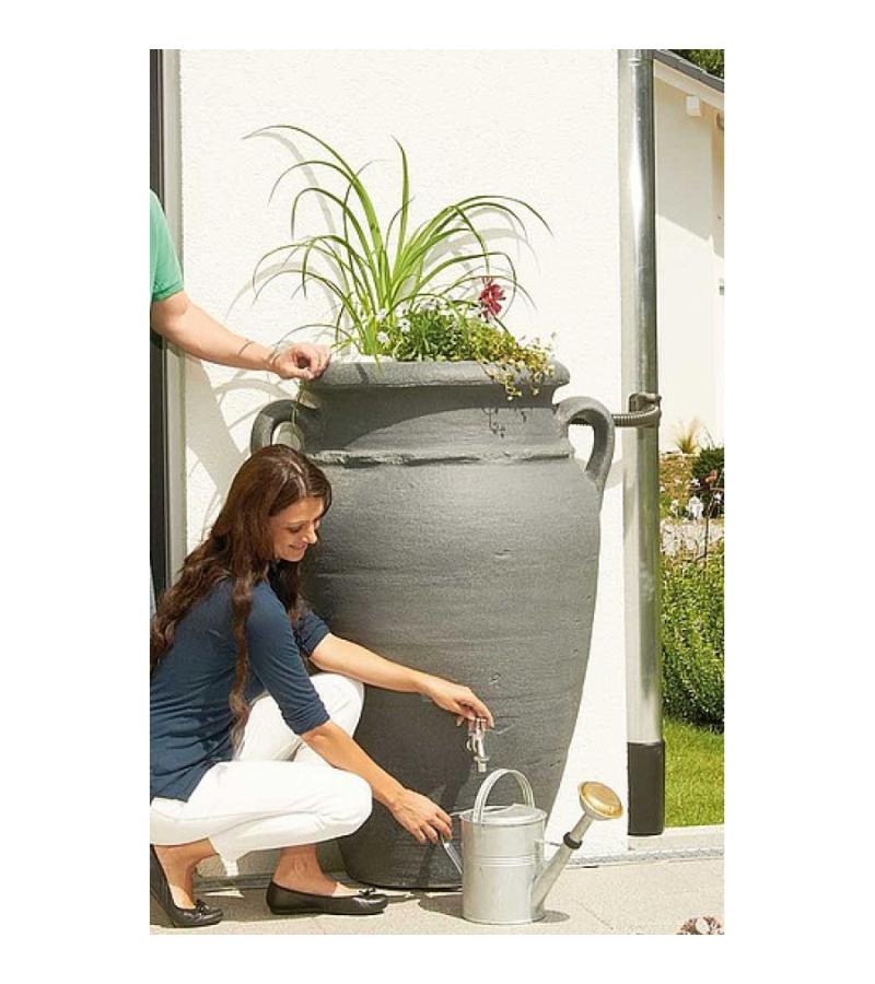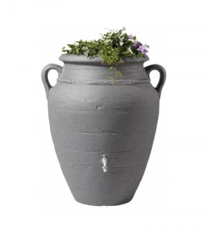De Amphore regenton met bloembak is een ton gemaakt van kunststof die maar liefst 360 liter regenwater kan opvangen. Het regenwater komt uiteindelijk in de ton terecht via de regenpijp, maar ook via de plantenbak. Om ervoor te zorgen dat het regenwater niet wordt verontreinigd met potgrond uit de plantenbak is de plantenbak voorzien van een viltlaag. Onderaan de regenton zit een aftappunt die het makkelijker voor u maakt om de regenton in de winter leeg te laten lopen om zo te voorkomen dat de ton kapot vriest. De Amphora regenton wordt geleverd met een chromen kraan en is tevens verkrijgbaar in de kleuren terracotta en zandsteen.