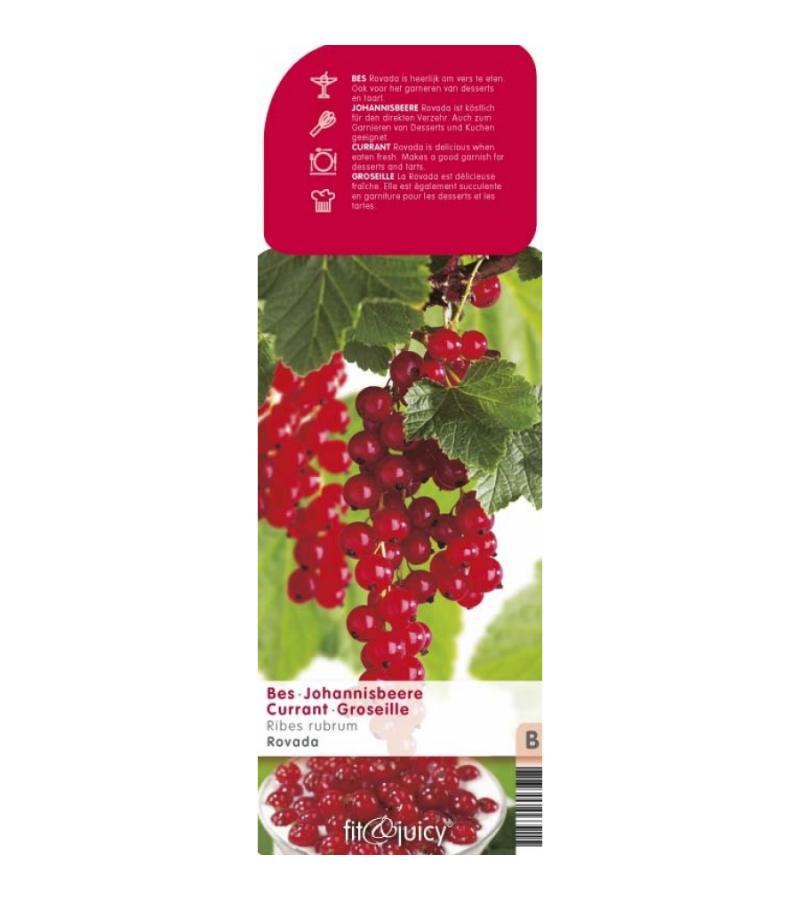 Een prima zelf te telen rode bes is de Rovada. Deze plant draagt zijn vruchten op zowel eenjarig als tweejarig hout. Snoeien doet u dus vooral het oudere hout. De decoratieve trossen met besjes zijn eetbaar vanaf eind juli. Rode bessen staan bekend om hun zure smaak en worden vaak gebruikt in zoete gerechten als friszure tegenhanger.