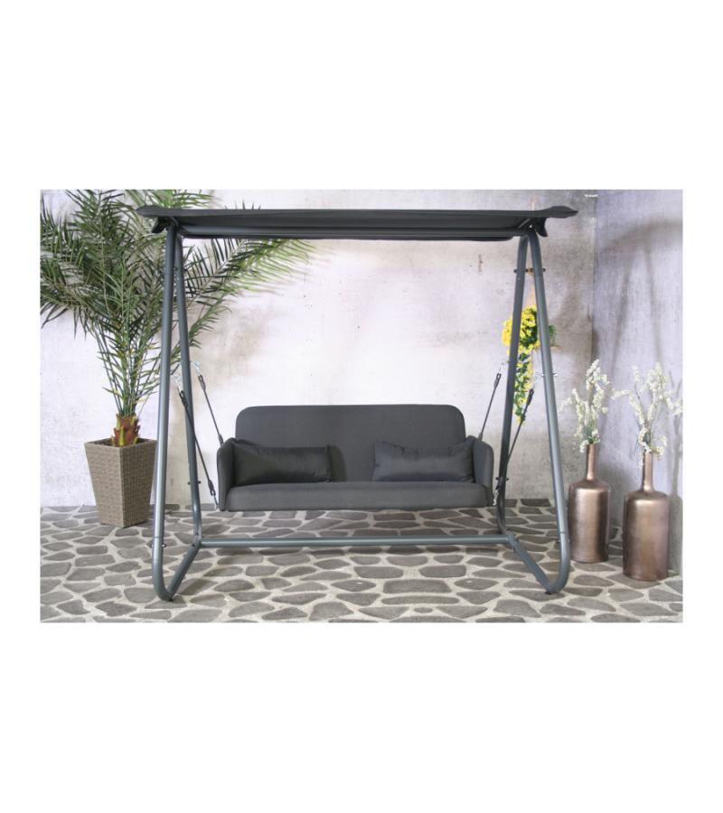 De SenS-Line Schommelbank Haiti is een moderne grijze schommelbank voor in de tuin, terras of voor op het balkon. Geniet samen van een heerlijke zomerse dag in de tuin met deze tweezits schommelbank. De SenS-Line Schommelbank Haiti heeft een heerlijk zitcomfort en wordt geleverd met kussens opgevuld met sneldrogend foam. Het schuim in de kussens is bestand tegen weersinvloeden en laat vocht makkelijk door. De schommelbank hangt veerkrachtig aan een donker frame welke op rubberen wieltjes staat welke je terrastegels beschermen tegen krassen. Bovenop het frame zit nog een schaduwdak wat je tegen direct zonlicht beschermt.