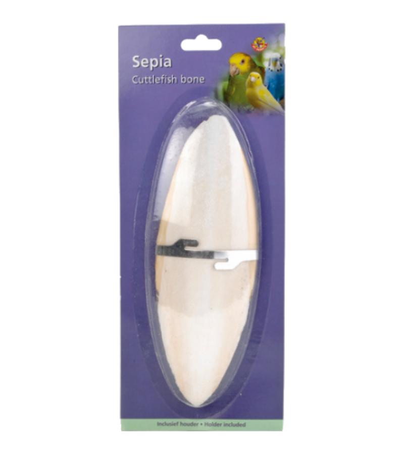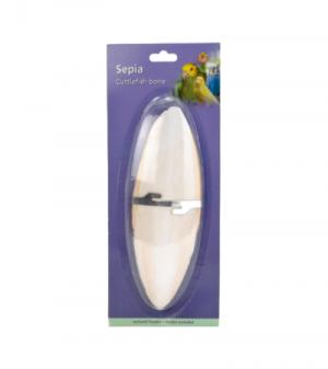 Sepia bestaat uit harde kalk aan de buitenzijde en de binnenzijde is wat zachter en bestaat uit zouten. Sepia is een 100 % natuurproduct. Het is een bron van mineralen die uw vogel ten goede komt. Dit is een extra grote sepia van 20 cm, voorzien van een ophangclip.