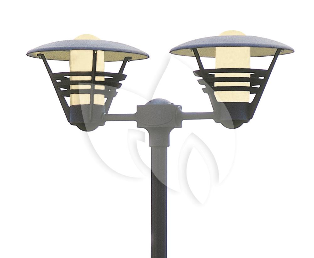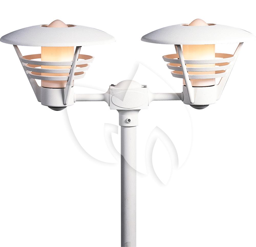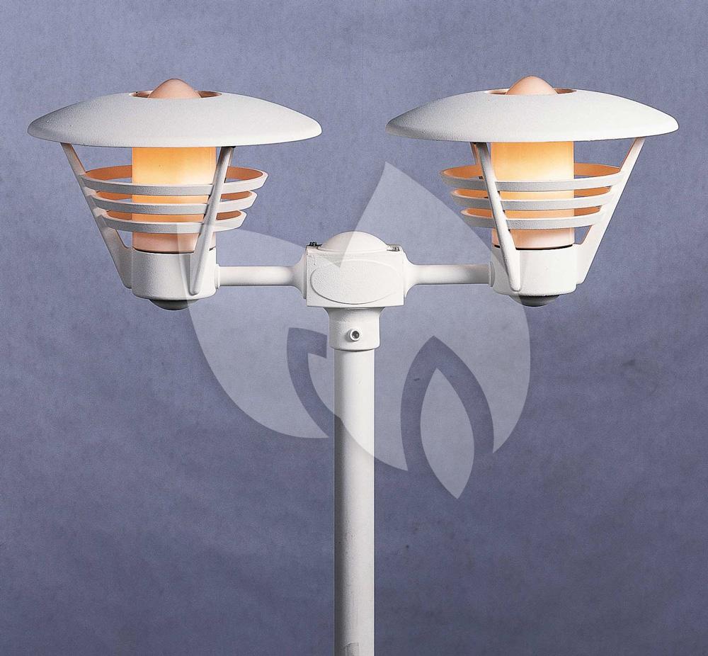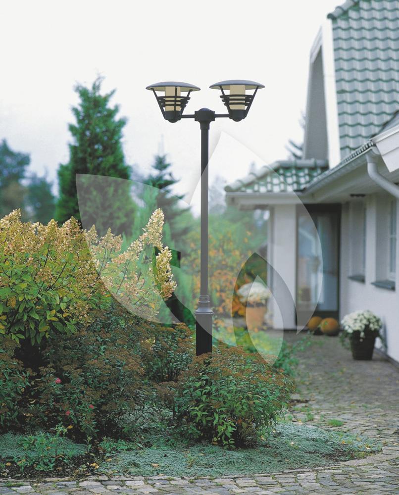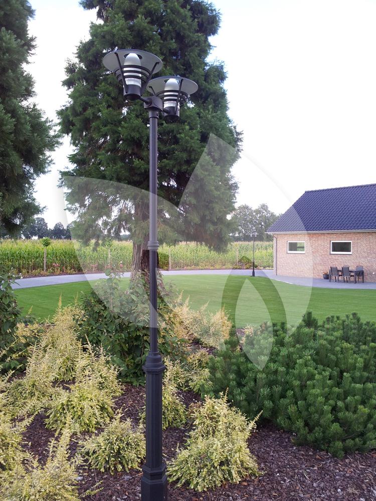 Brenge nieuwe sfeer in uw tuin met dit staande verlichtingsarmatuur. De twee lampen geven extra veel licht en verlichten uw tuin op een donkere dag. Hij is gemaakt van gelakt aluminium met opaal glas en is verkrijgbaar in twee kleuren. Corrosie is geen punt met de anti-corrosie garantie van maar liefst 25 jaar. Hij is handgemaakt in Europa, en is geschikt voor verschillende E27 lichtbronnen tot maximaal 100 watt. De IP-rating is IP-23 (regenwaterdicht). Dit product komt exclusief lichtbron en paal of sokkel.