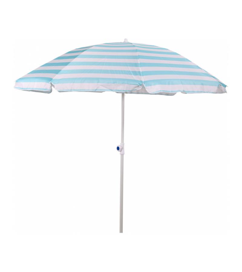 De strandparasol Libra heeft een blauw wit streepmotief en heeft hierdoor een gezellige uitstraling. Mocht u liever een andere kleur parasol willen is dit geen probleem, de strandparasol Libra is verkrijgbaar in diverse kleuren. De parasol is erg stevig door de acht metalen baleinen en deze baleinen maken de parasol ook eenvoudig te openen en te sluiten. Het doek is van 160 grams polyester welke voor een perfecte blokkering van schadelijke UV-straling zorgt. Onbezorgd genieten doet u onder de strandparasol Libra!