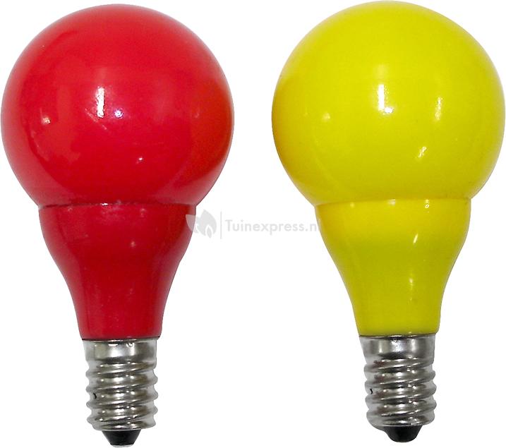 Deze losse LED lichtbronnen zijn geschikt als vervangingslamp voor party verlichting. De lichtbron heeft een vermogen van 0.24 watt en is voorzien van een E14 fitting. De LED lichbron is verpakt per twee stuks, het betreft een rode en een gele lamp.
