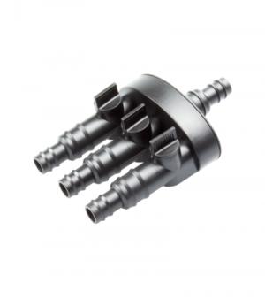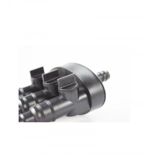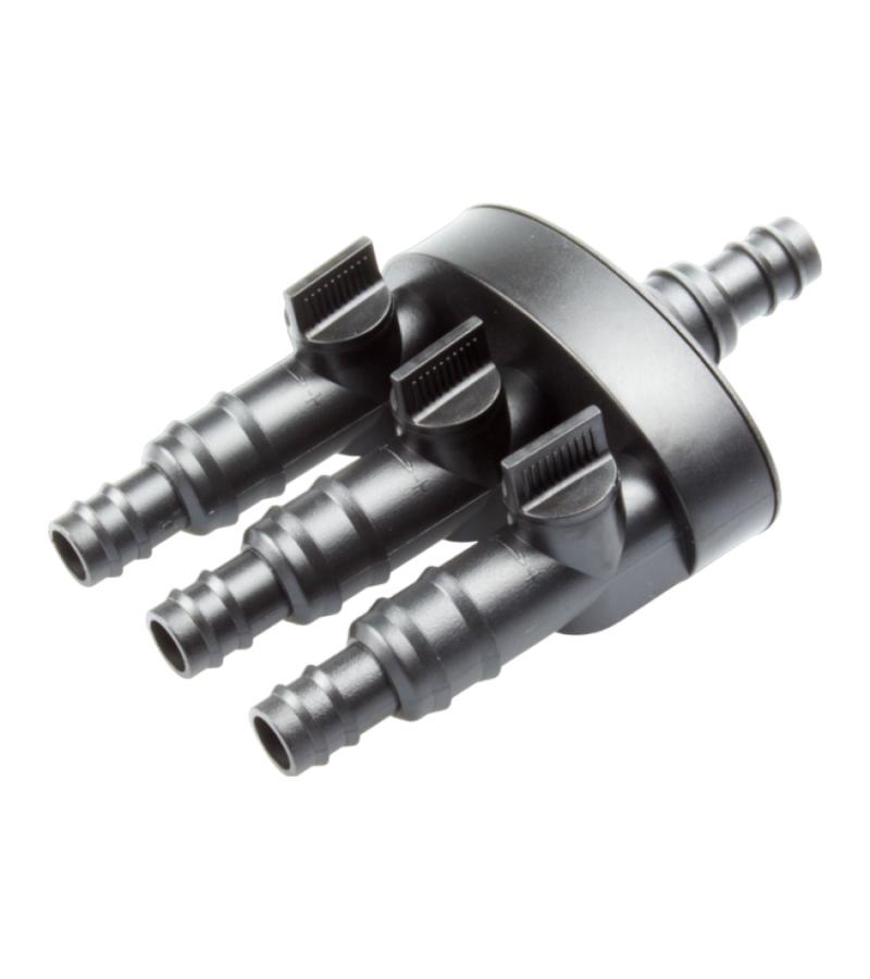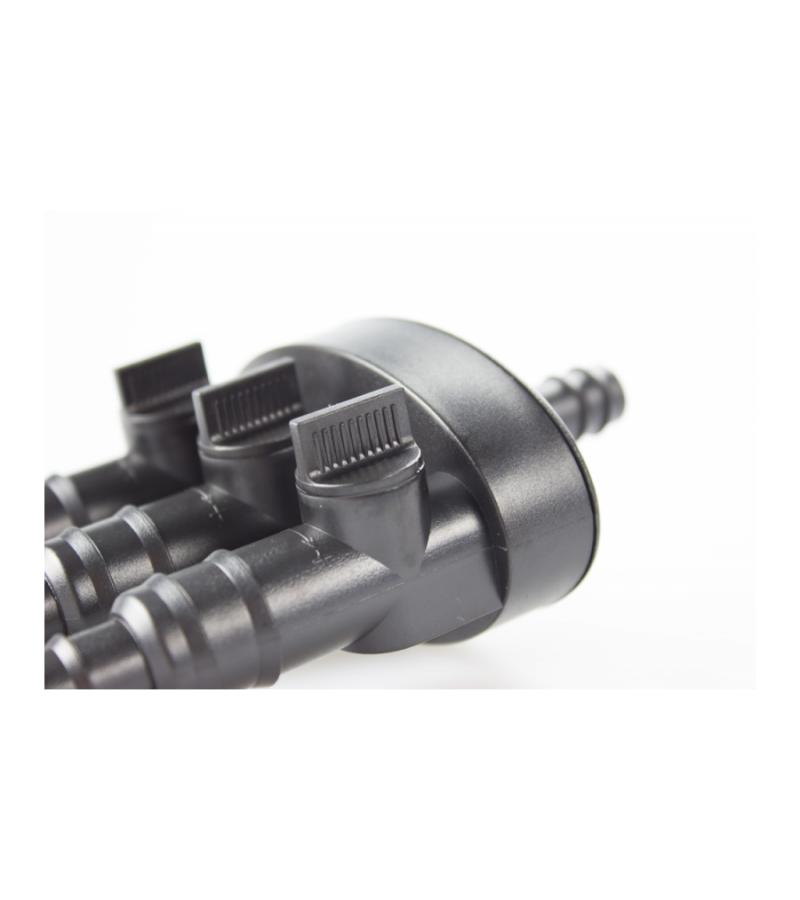 Kunststof 3-weg kraan met 13/19 mm aansluitingen. Op iedere uitgang zit een regelkraan om de doorstroming te kunnen regelen. Voor bijvoorbeeld het verbinden van vier stukken vijverslang. De waterkraan is niet geschikt in een droog opstelling