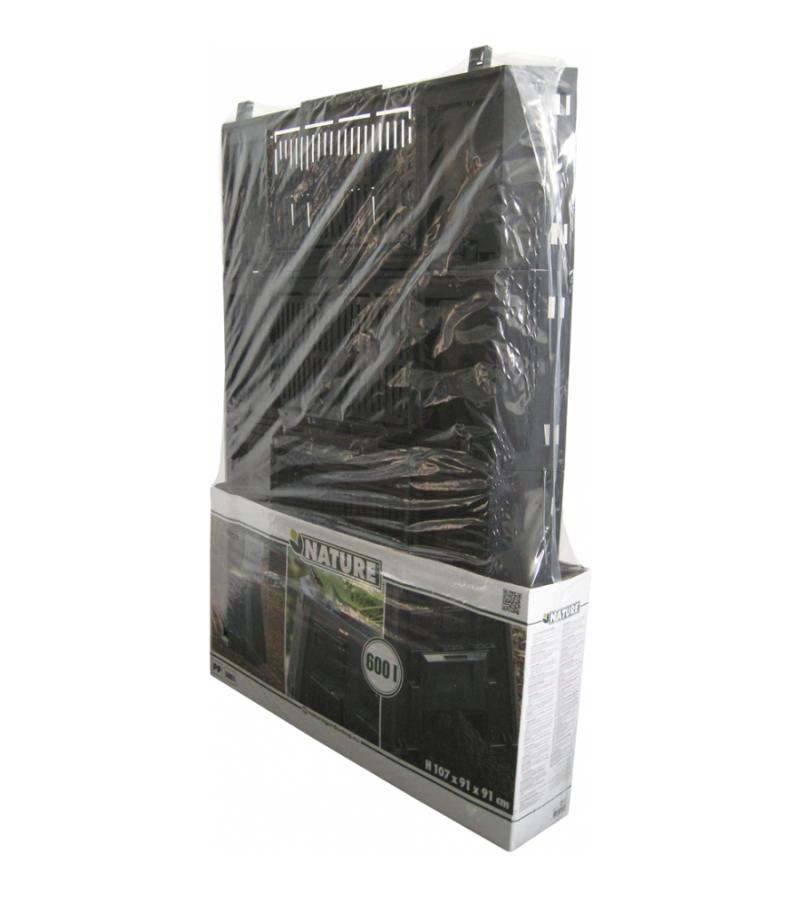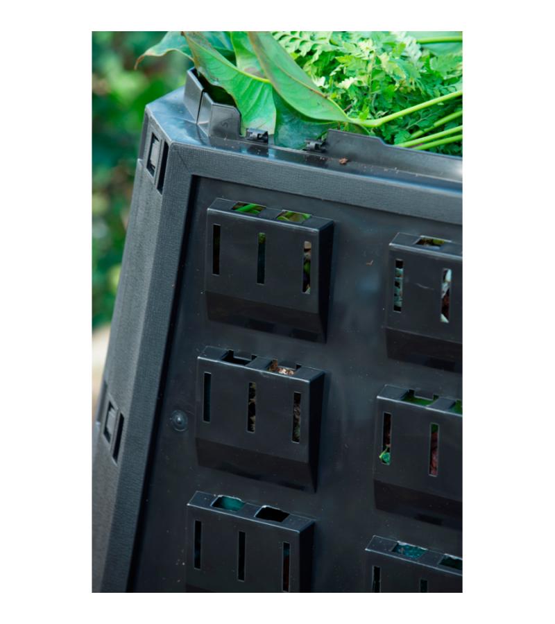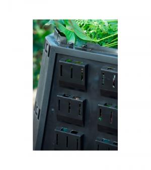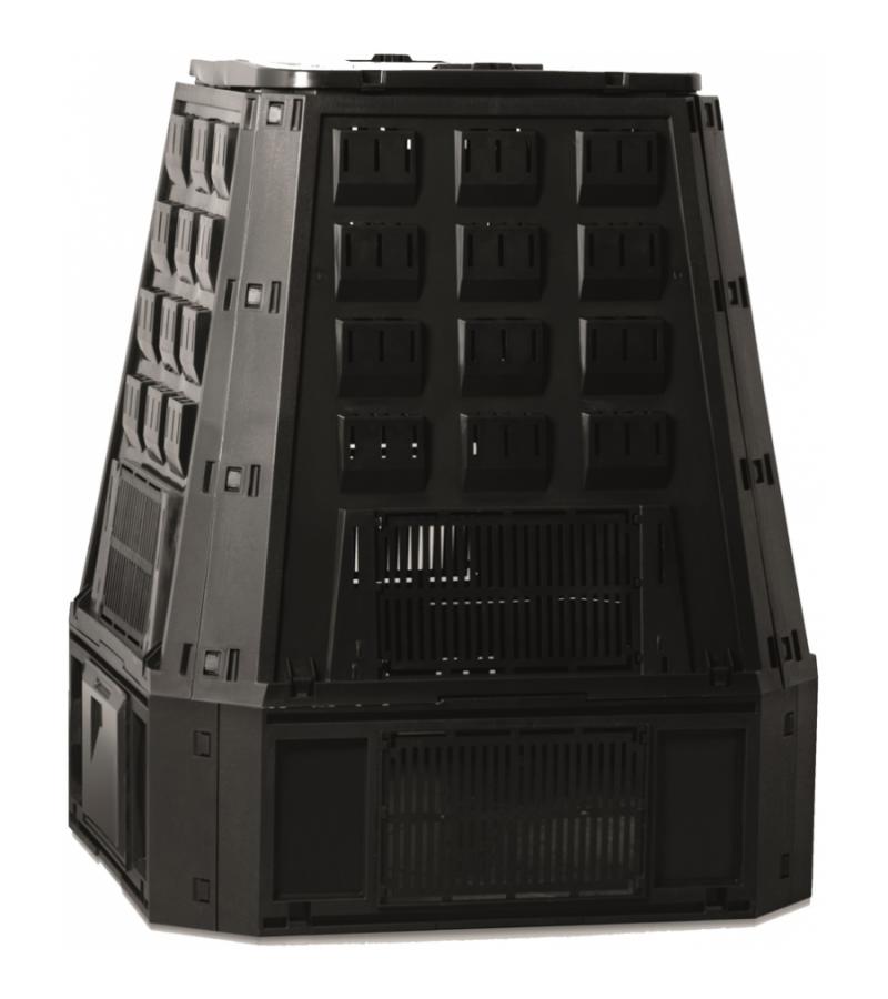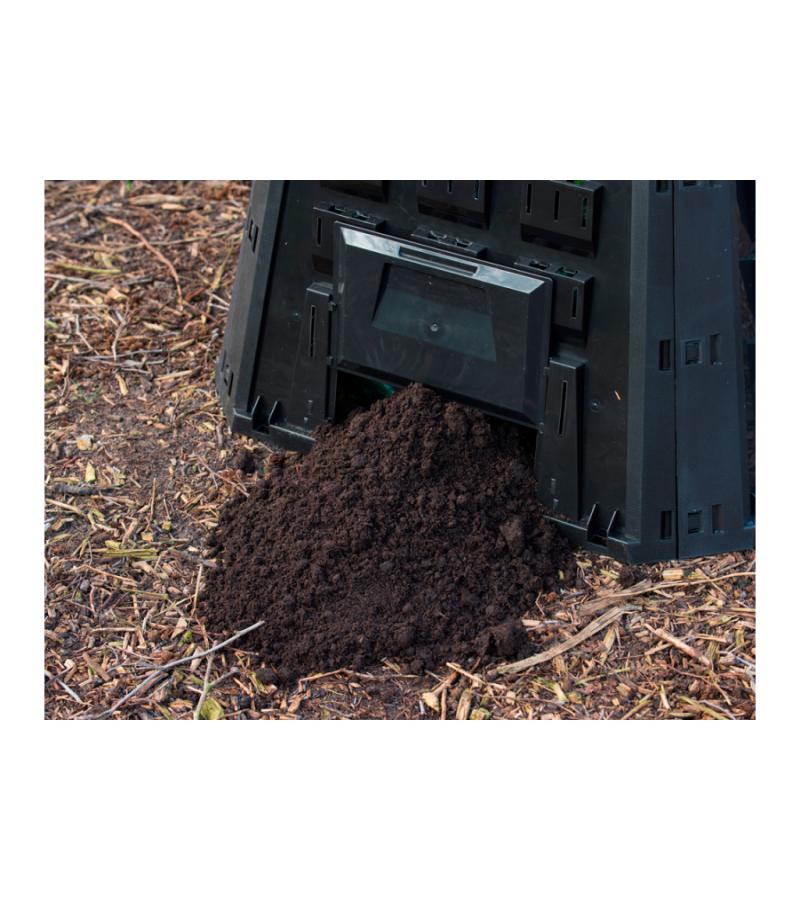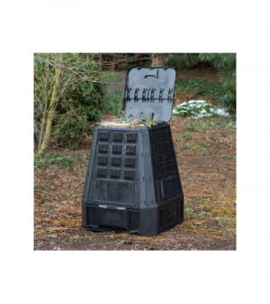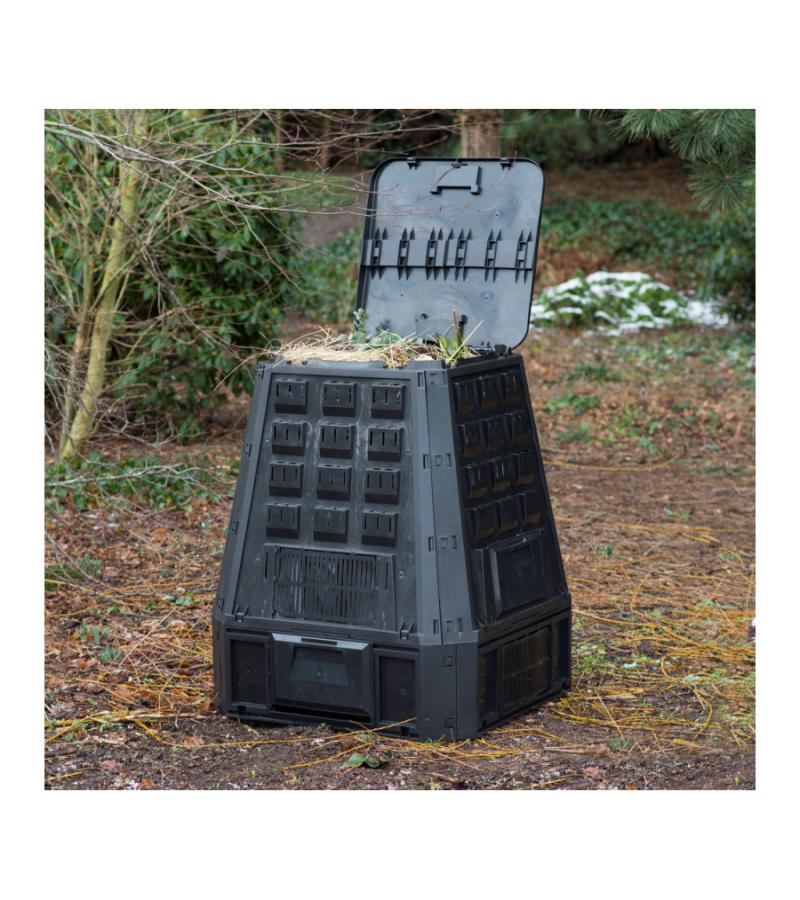 De compostbak is vervaardigd uit bestendig polypropyleen en heeft een inhoud van 600 liter. De zwarte compostbak is voorzien van een scharnierend deksel om het afval in te werpen en een opening aan de voorzijde om de compost te kunnen omwoelen of verwijderen. In de wanden van de silo zijn Thermolen verwerkt die voor een constante hoge temperatuur zorgen waardoor het afval sneller wordt afgebroken. De compostbak beschikt over een inklapbaar systeem waardoor hij makkelijk in elkaar te zetten is en waarnodig eenvoudig opgebergd kan worden. Om micro-organismen aan te trekken kunt u het compostvat het beste op de grond in de schaduw neerzetten. Leg op de bodem enkele takken neer, dit zal zorgen voor een goede afwatering en verluchting.