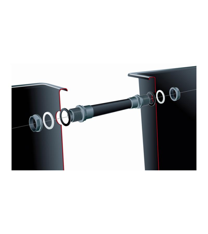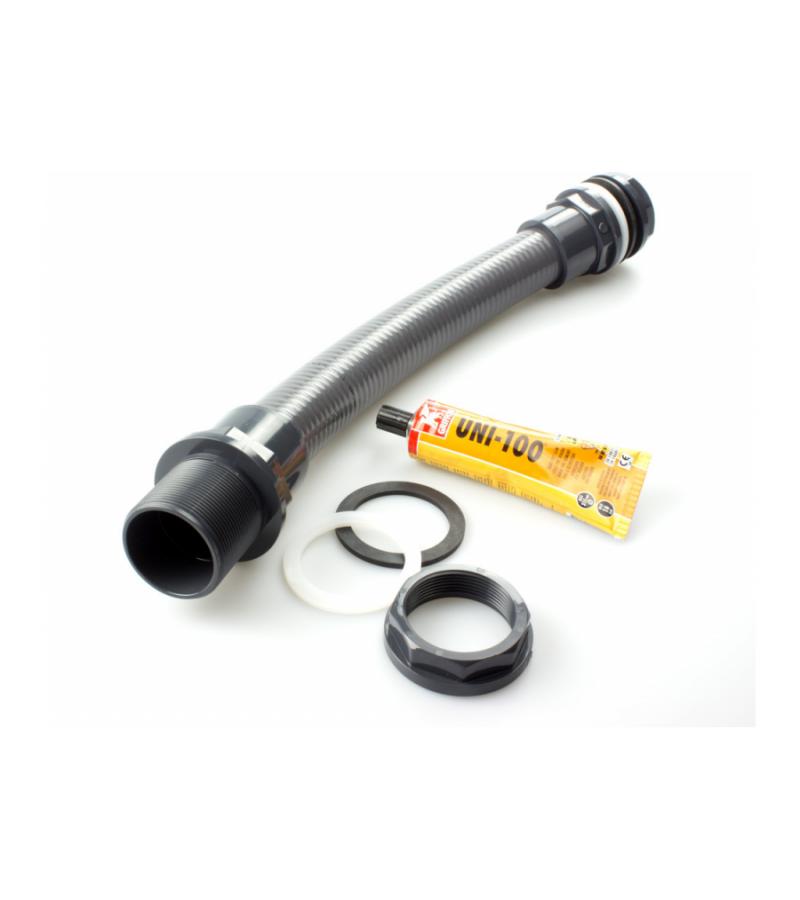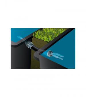 Gebruik het vijver verbindingsset om vijvers op een veilige manier te verbinden. Boor een gat van 60mm in een vlak gedeelte van de vijver om de doorvoer waterdicht te kunnen plaatsen.