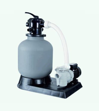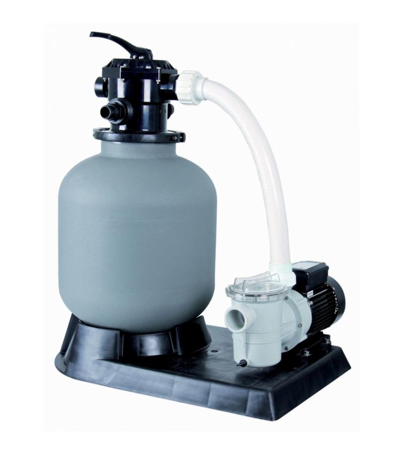 Zandfilterpomp met alle voerzieningen (6-standenklep, filters, manometer, enz.), pomp, voet en verbindingsslang.