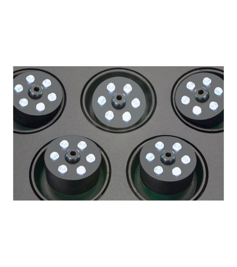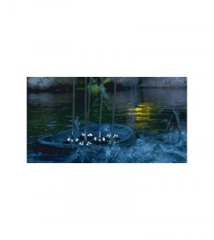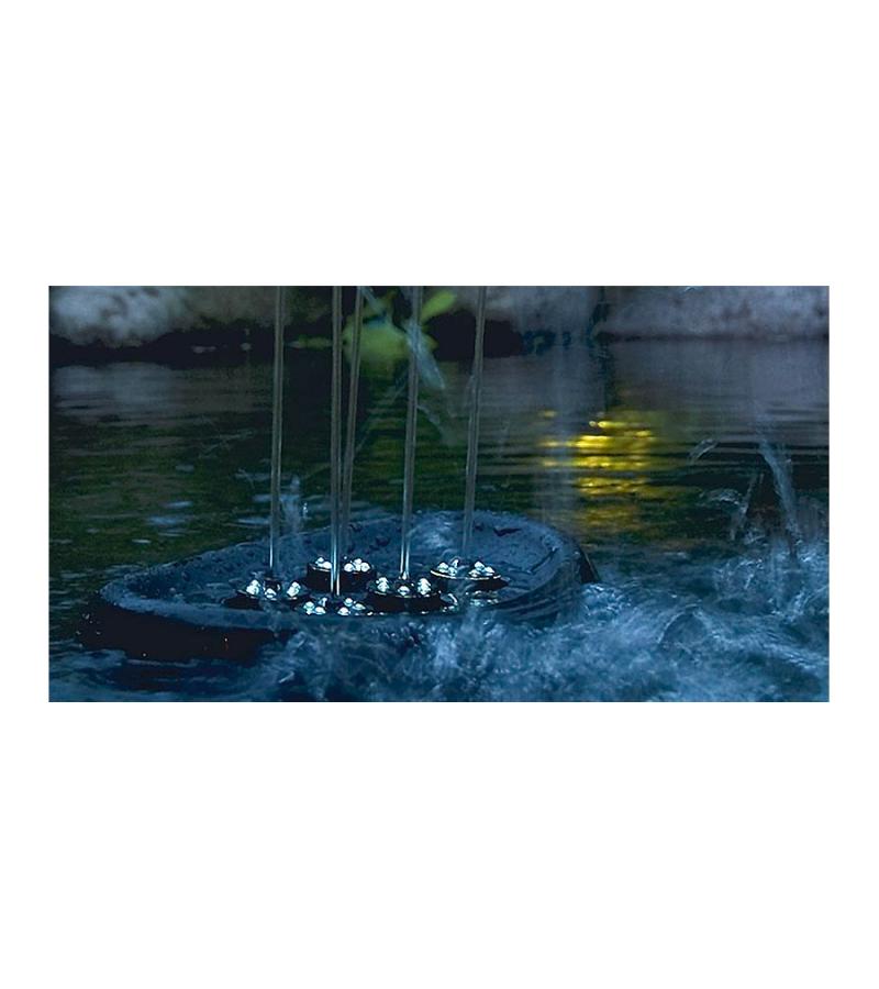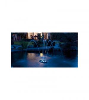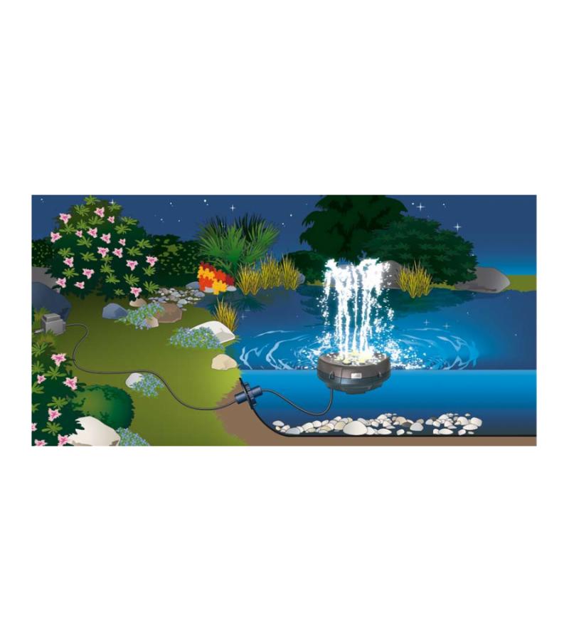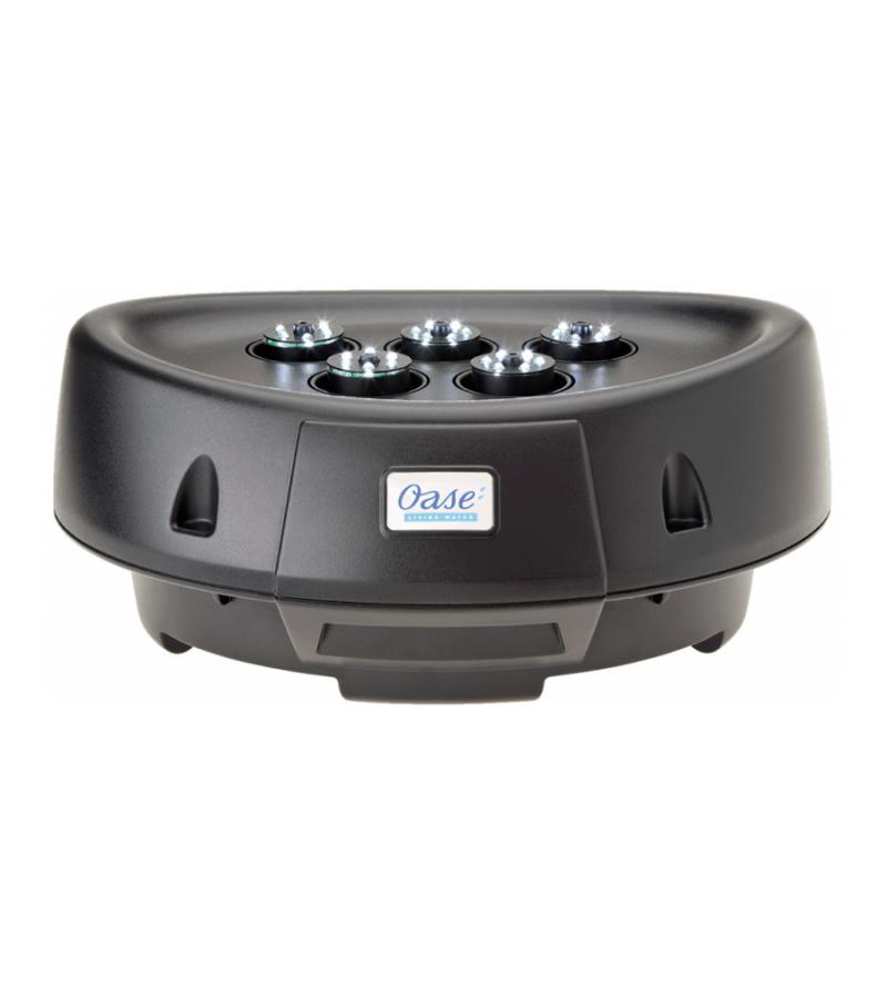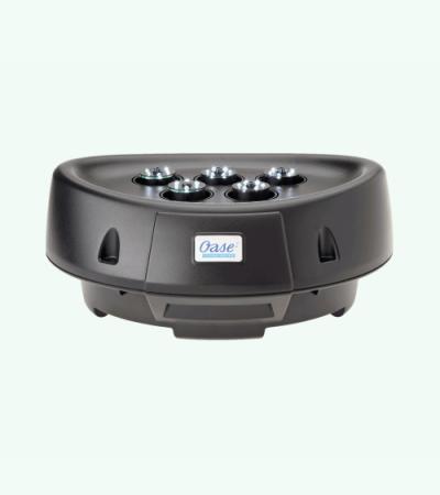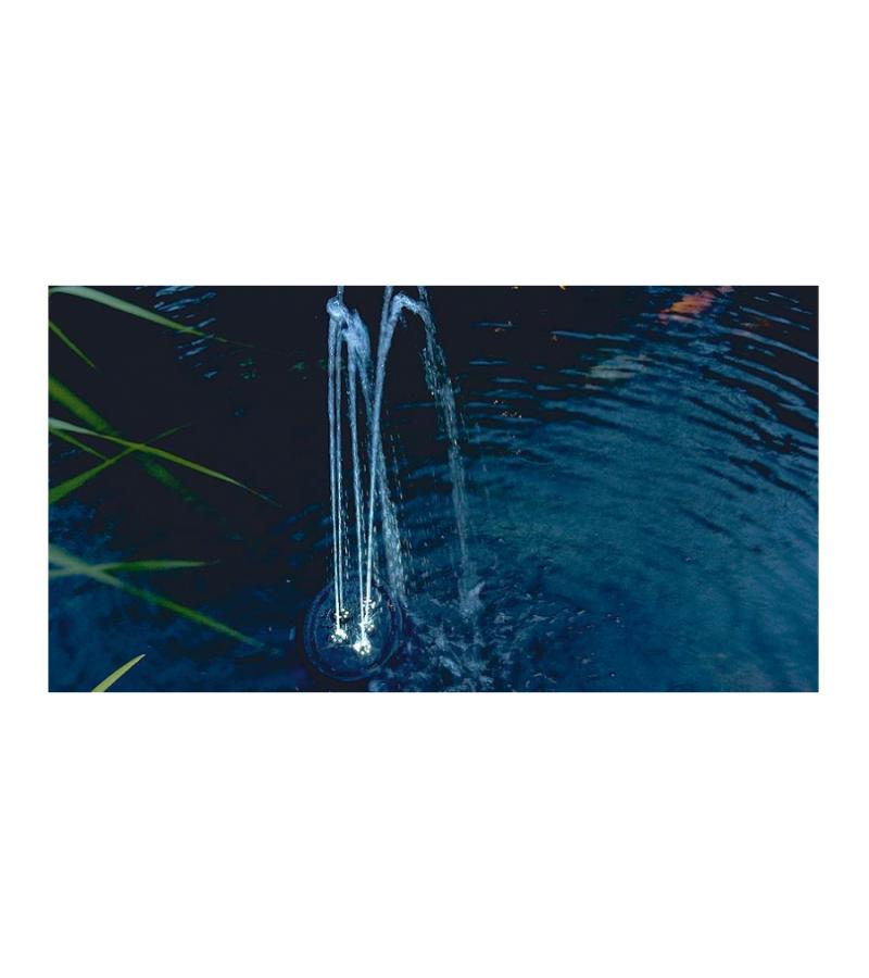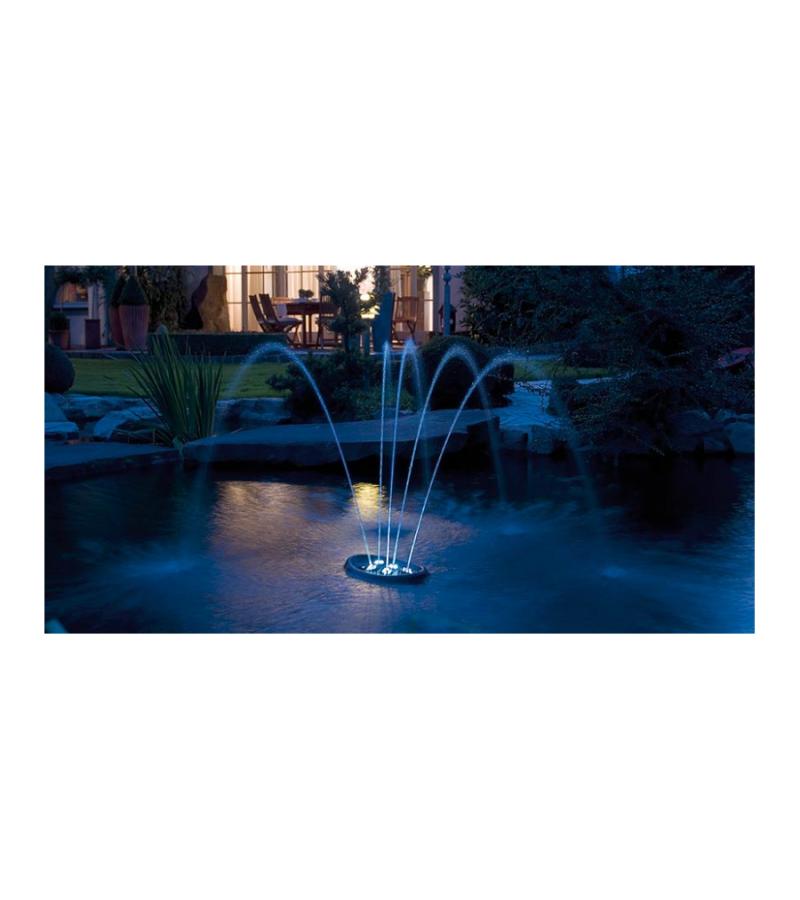 Compacte fontein – met grooteffect! De compacte, drijvende fontein brengt leven op het terras en in de tuin – ook als er maar weinig ruimte is. De vijf sproeikoppen incl. LED lichtring kunnen individueel ingesteld worden en geven verschillende waterfiguren weer. De vijf geïntegreerde pompen en de LED-lampen functioneren met behulp van de veilige, stroombesparende 12V veiligheidslaagspanning. De fontein kan zowel drijvend ingezet als ook met behulp van bevestigings-ogen op de bodem geplaatst worden. Door het OASE »Plug’n‘Spray concept« is de installatie en ingebruikname bijzonder snel en eenvoudig.