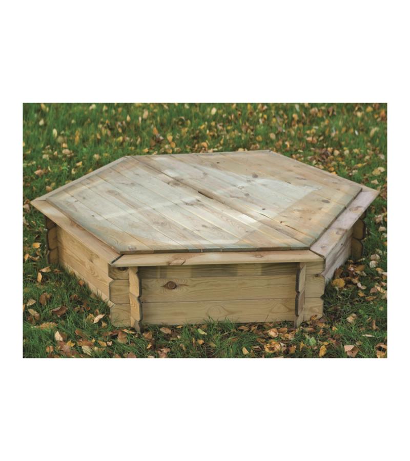 Zeskantige zandbak van geimpregneerd grenen. Voorzien van zitplanken rondom.