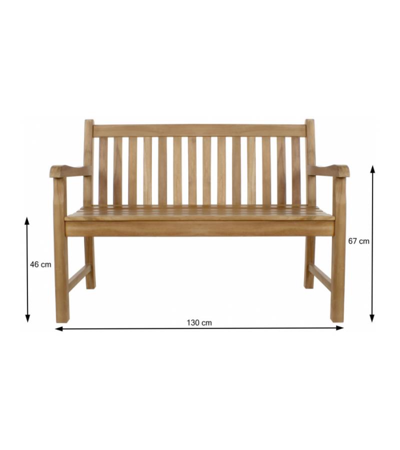 De tuinbank heeft een lengte van 130 centimeter en biedt hiermee plaats aan twee personen. De Alicante tuinbank is ook verkrijgbaar in de lengtematen 150 en 180 centimeter. Door de strakke uitstraling en het natuurlijke materiaal heeft de tuinbank een mooie uitstraling en staat hij als een mooie accessoire in uw tuin, op het terras of op het balkon.