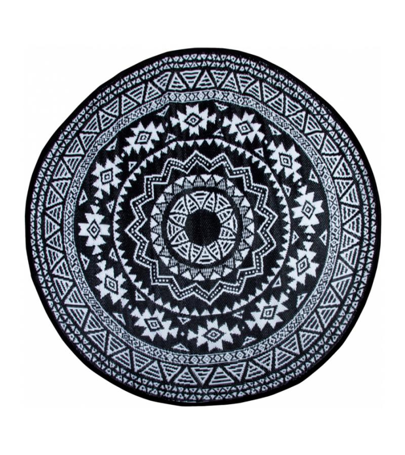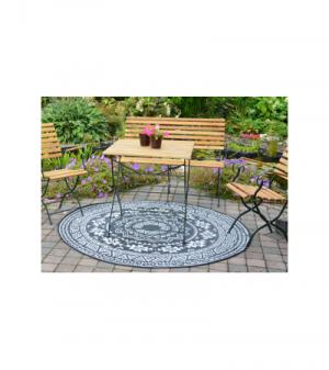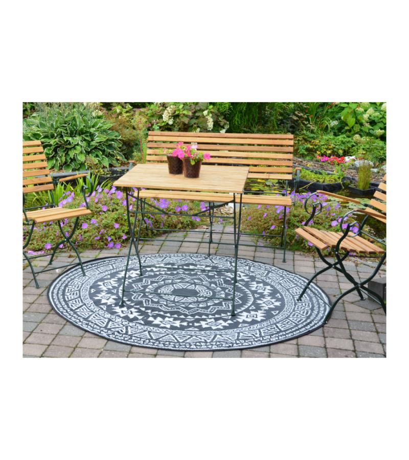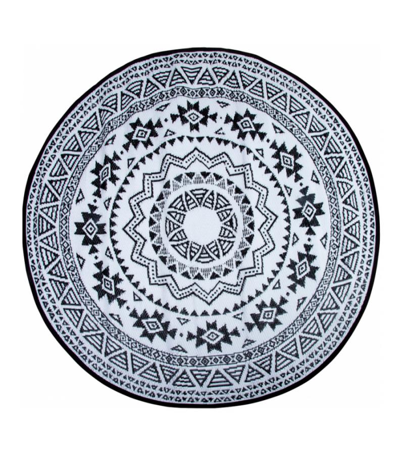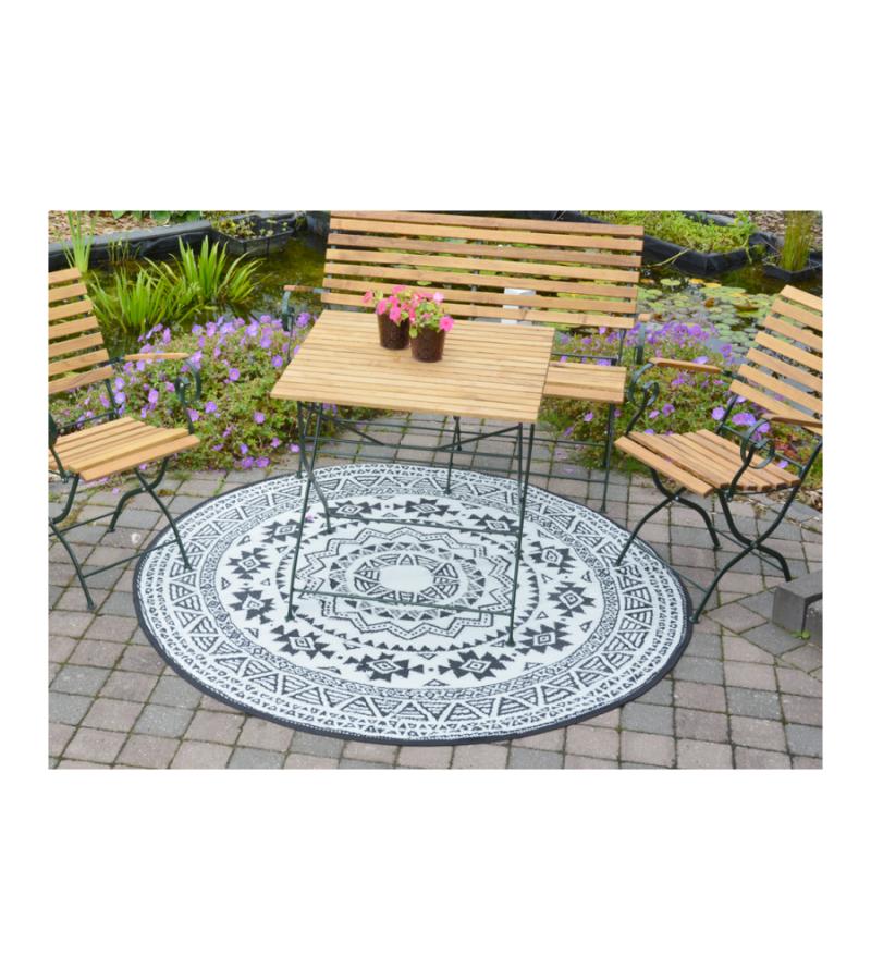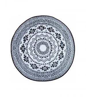 Rond is het nieuwe recht! Waar men voornamelijk geneigd is lijnrechte vormen in de inrichting terug te laten komen, maakt rond nu zijn opmars! Zo ook dit ronde tuintapijt met Azteken print. Het vloerkleed heeft een diameter van 180cm. Dit leuke kleed is uiteraard onder uw tuinset te plaatsen, maar denkt u ook eens aan een gedeelte van uw loungeset; het tuintapijt kan ervoor zorgen dat dat bijzettafeltje met uw favoriete planten nog meer in het oog springt!