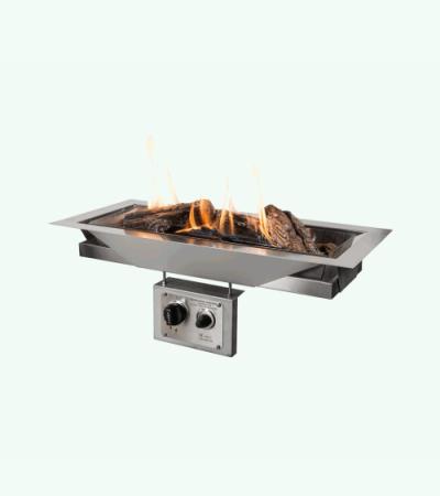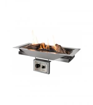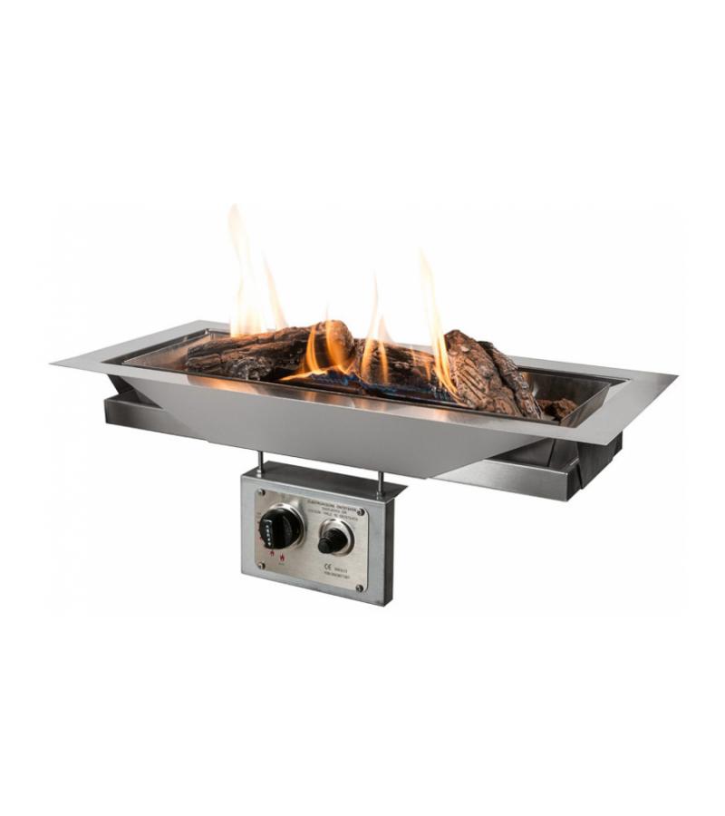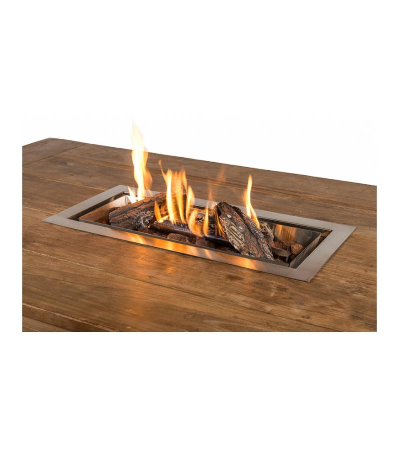 De rechthoekige inbouwbrander werkt op gas en is voorzien van een RVS-brander van 12kW. De brander wordt mooi gecamoufleerd door optische lavastenen en houtblokken. Hierdoor lijkt het vuur op een echt houtgestookt vlammenspel, maar heeft u geen last van rook of rondspringende vonken en dat is wel net zo prettig aan tafel. De haard is zeer gebruiksvriendelijk. Door middel van de elektronische ontsteking steekt u de brander gemakkelijk aan en met de draaiknop kunt u de hoogte van de vlam afstellen.