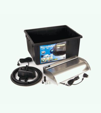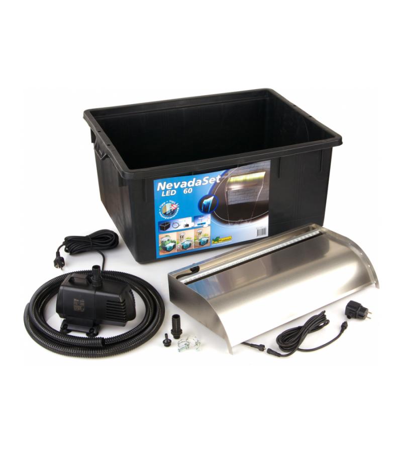 Met de Nevada waterval set heeft u direct alles in huis om de prachtige waterval Nevada te kunnen installeren! De Nevada is een moderne design waterval met een unieke gebogen wateruitloop waardoor er een bijzonder en aantrekkelijk waterspel ontstaat. De led-verlichting zorgt ervoor dat de waterval in het donker mooi wordt verlicht en creëert als het ware een extra dimensie in uw tuin!